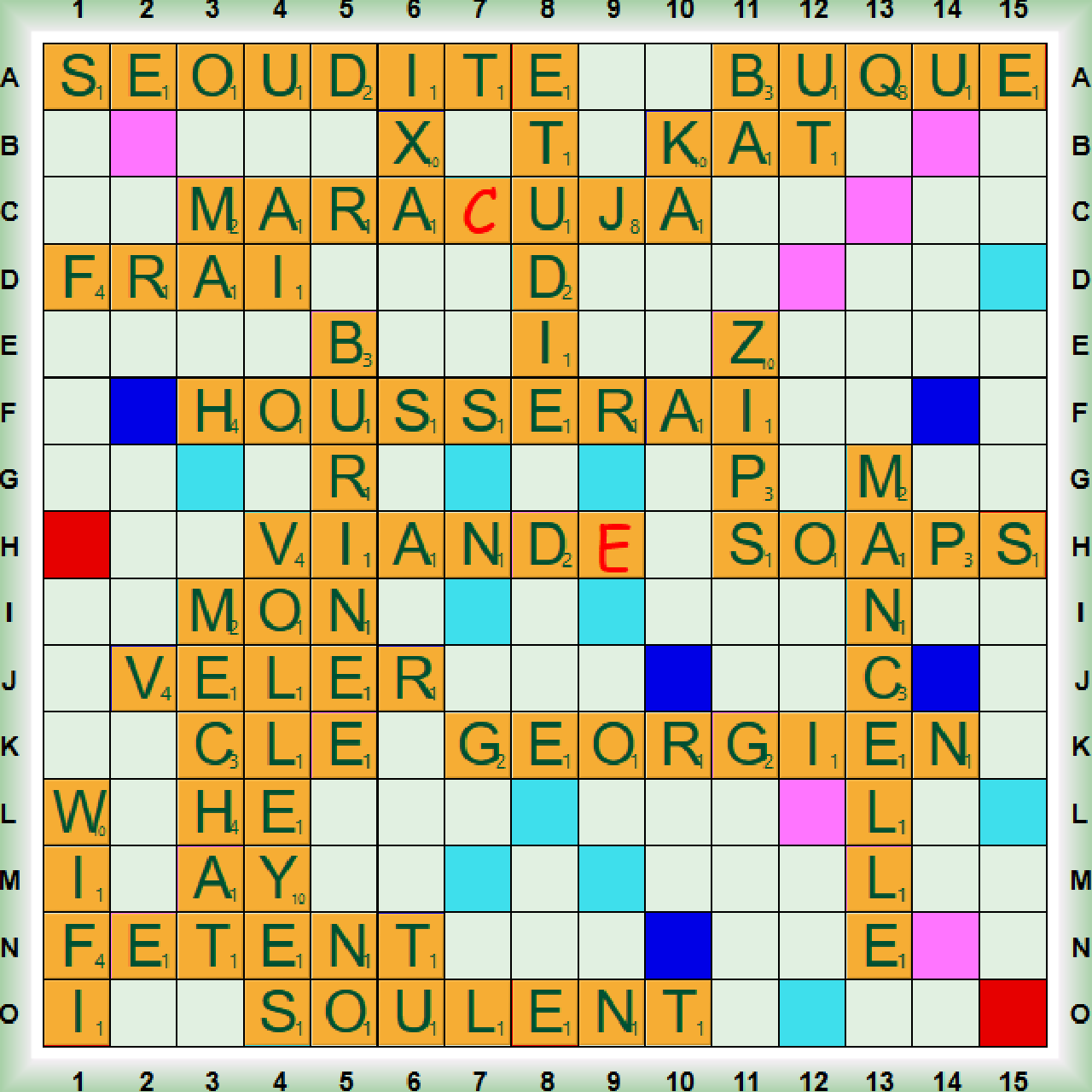 La partie tirée au sac débute par VIAND(E) suivi de VOLLEY puis FÊTENT qui forme VOLLEYE (du verbe VOLLEYER: Au tennis, frapper une balle de volée). Nous posons un premier scrabble SOÛLENT en collante puis BURINÉE, CHAT et WIFI avant un nouveau scrabble HOUSSERA et ÉTUDIE. Nous jouons ensuite un troisième MARA(C)UJA (=MARACUDJA: nm Fruit de la Passion) suivi de ZIP, KAT, BUQUE (du verbe BUQUER: Frapper) et SOAPS (nm. Feuilleton télévisé populaire). Nous poursuivons avec deux scrabbles SÉOUDITE (=SAOUDITE: adj. Relatif à l’Arabie saoudite) et MANCELLE (adj. Du Mans ou Attache reliant le collier d’un cheval au limon de la voiture). Nous jouons ensuite IXA, VÊLER qui transforme CHAT en ÉCHÂT (du verbe ÉCHER=AICHER=ESCHER Garnir un hameçon d’un appât) puis MON qui transforme ÉCHÂT en MÉCHÂT (du verbe MÉCHER: Assainir (un tonneau) en y faisant brûler une mèche soufrée). La partie s’achève avec un dernier scrabble GÉORGIEN (adj De Géorgie; nm Langue du Caucase) suivi de FRAI (nm. Ponte des oeufs chez les poissons).