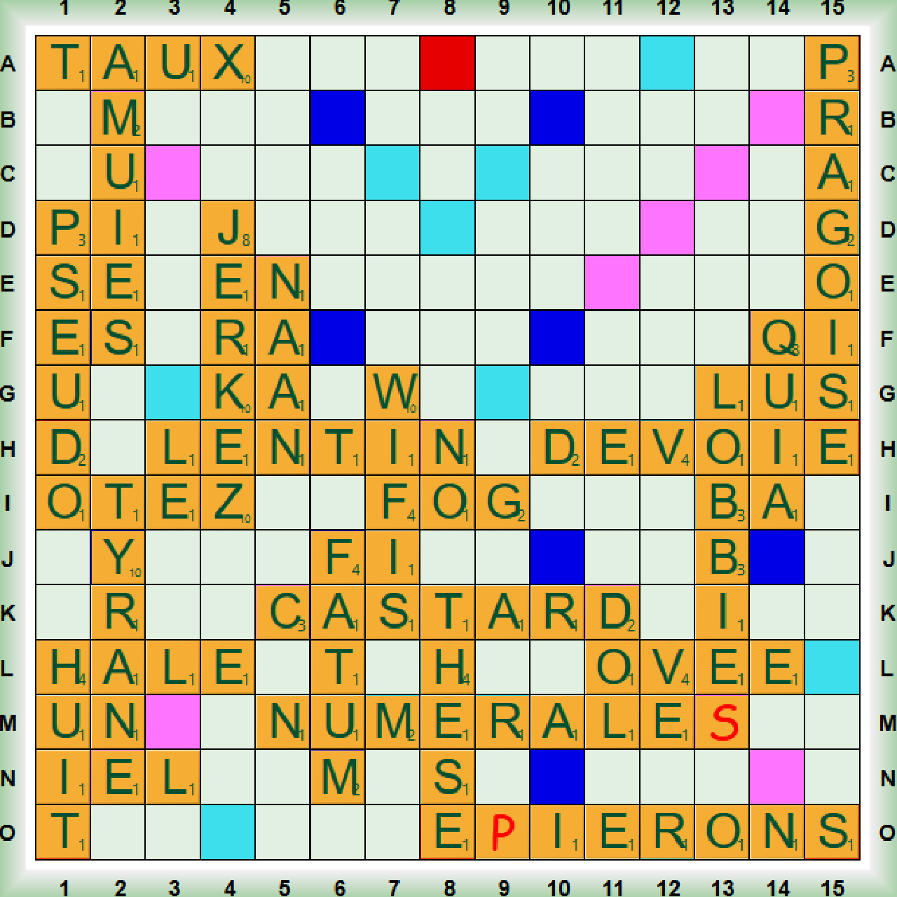 La partie démarre avec LENTIN (nm champignon comestible japonais), JERKE, ÔTEZ, FOG (nm brouillard), PSEUDO, TYRAN, HUIT et WIFIS. Nous jouons FATUM (nm destin) puis les 2 premiers scrabbles NUMÉRALE et LOBBIE(S) (LOBBY pl LOBBYS ou LOBBIES nm groupe de pression) suivis de CASTARD (=CASTAR féminin CASTARDE adj et n belg formidable, costaud) et IEL (pl IELS pr pers désigne une personne sans préciser son genre) qui forme TYRANE. Nous poursuivons avec THÈSE, AMUÏES (AMUÏR vt phon devenir muet), DÉVOIE, TAUX et le 3ème scrabble PRAGOISE (PRAGOIS, E = PRAGUOIS, E adj de Prague). Après NAAN (=NAN nm galette de pain dans la cuisine indienne), nous scrabblons avec É(P)IERONS et nous terminons avec QUIA (À QUIA invariable, loc être à quia : n’avoir rien à répondre), OVÉE et HÂLE.