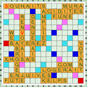 La partie, jouée en 2 min 30 par coup, commence avec 4 scrabbles: BAYEREZ (du verbe BAYER, utilisé dans l’expression Bayer aux corneilles, s’ennuyer), SAMPLIEZ (du verbe SAMPLER = Mus. Échantillonner), REN(V)OYAI et DÉNUERAI. Nous posons ensuite XHOSAS (Adj. D’un peuple de l’Afrique australe), un nouveau scrabble ACIDITÉS, MURA en collante et un autre scrabble (S)OUHAITS. Nous poursuivons avec WEB, FUNE (nf. Cordage qui sert à remorquer un chalut) et ABROGENT en double appui et collante. Nous scrabblons avec ENJUIVES (du verbe ENJUIVER: Péj. Pénétrer d’une prétendue influence juive) puis nous jouons FUTÉ en collante avant un dernier scrabble LOGERAI. La partie s’achève avec KELPS (nm. Algue brune géante) qui forme LEK (nm. Unité monétaire de l’Albanie), VOTANT et COM.