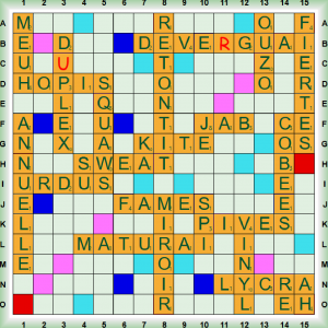 La partie qui est un simultané fédéral partie normale, démarre avec SWEAT suivi du 1er scrabble RETONTIT (RETONTIR ppi queb fam réapparaître, rebondir) suivi de SQUAW, HOPIS (HOPI, E adj et nm d’un peuple amérindien), URDUS (URDU = OURDOU nm langue parlée au nord de l’Inde et au Pakistan) et du 2ème scrabble ANNUELLE. Nous jouons DUPLEX, 2 nouveaux scrabbles DÉVE(R)GUA (DÉVERGUER vt ôter une voile de sa vergue) et FIERTÉS puis KITE, COBÉE (=COBÆA =COBÉA nm arbuste grimpant à fleurs bleues), PIVES (PIVE nf helv fruit des conifères) et MEUH. Nous poursuivons avec OUZO, VINYL (=VINYLE), JAB (nm petit direct à la boxe), LYCRA (nm textile synthétique) et le dernier scrabble MATURAI (MATURER vt durcir un alliage). Nous terminons avec EH, MIROIR et FAMÉS.