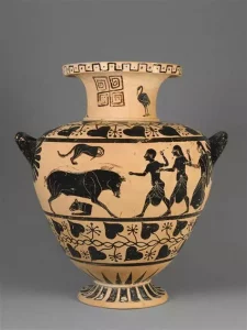 La partie démarre avec NYLON, HYDRIE (nf archeol Grand vase grec à eau, voir photo), XIÈME (=IXÈME) suivis de 3 scrabbles DURHAM(S) (DURHAM n et adj race bovine), TRIPHASÉ et BESOGNA. Nous jouons JONÇA (JONCER vt garnir de jonc, canner), AXIEZ, WON(S), UVÉE, TIGERA, SMOK (nm fam smoking) et nous prolongeons TAXIEZ en DÉTAXIEZ. Nous poursuivons avec TOKAI (1 =TOKAY nm ancien nom du pinot gris d’Alsace – 2 =TOKAJ ou TOKAY nm vin liquoreux de Hongrie), FEUS, VÊTUE, NARVAL (NARVAL, S nm cétacé arctique) et le dernier scrabble PARTÎTES. Nous terminons avec QUE, SIL (nm argile), FÉRU et CLÉ.