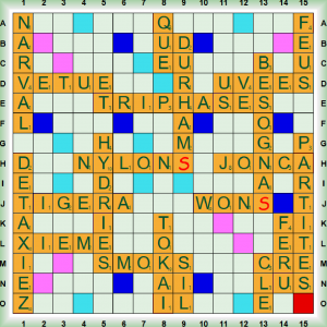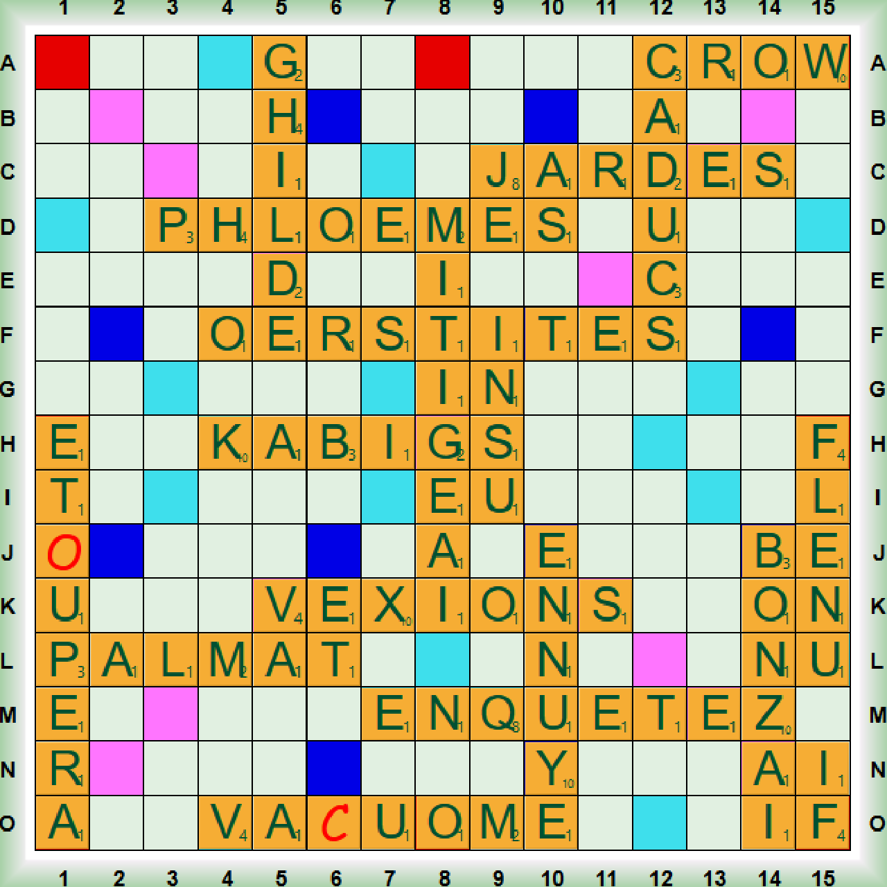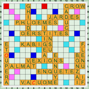 La partie, jouée en 2min 30, débute par KABIG (=KABIC nm. Veste de drap à capuchon) puis deux scrabbles MITIGEAI et PHLOÈMES (nm Tissu végétal où circule la sève). Nous posons VEXIONS en quadruple avant un nouveau scrabble ŒRSTITE (nf. Acier au titane et au cobalt) suivi de ENNUYÉ, QUÊTEZ et VA(C)UOME (nm Biol. Ensemble des vacuoles – cavité remplie de liquide – d’une cellule). Nous poursuivons avec CADUCS, CROW, JARDES (nf Tumeur au jarret d’un cheval) puis PALMÂT (du verbe PALMER Aplatir la tête d’une aiguille pour y percer le chas, mais aussi nager à l’aide de palmes ou honorer par une distinction telle que les palmes académiques), BONZAÏ et un dernier scrabble ÉT(O)UPERA (du verbe ÉTOUPER = Boucher avec de l’étoupe) en nonuple. La partie s’achève avec FLÉNU (adj. Se dit d’un charbon flambant), GHILDE (= GUILDE = GILDE Corporation au Moyen-Âge), IF, INSU et ENQUÊTEZ.