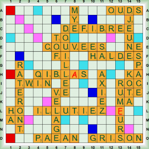 La partie qui est un simultané partie normale, démarre avec QIBL(A)S (QIBLA nf direction de la Mecque) suivi du 1er scrabble DOUILLÉE (DOUILLER vr arg payer) puis de COUVÉES, VÉLAGE, PÆAN (=PÉAN nm antiq gr hymne guerrier), TOF (adj belg fam super, extra) et du 2ème scrabble DÉFIBRÉE (DÉFIBRER vt dépouiller de ses fibres). Nous jouons HALDE (nf amoncellement de déblais de minerai), le 3ème scrabble ILLUTIEZ (ILLUTER vt med enduire de boue), AXIEZ, ESPACE, JEUNE et TWIN. Nous terminons avec OUDS (OUD = UD nm luth arabe) qui transforme JEUNE en DJEUNE, KOTA, RUM(E)UR, MYE (nf mollusque bivalve), GRISON (GRISON nm âne – GRISON, ONNE adj du canton des Grisons en SUISSE), le dernier scrabble RATERONT et HA.