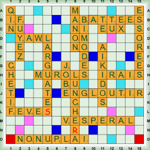 La partie, jouée démarre avec MUROL (nm fromage d’Auvergne) suivi du 1er scrabble ARGUÂTE(S) suivi de FÈVES, YAWL et de 3 nouveaux scrabbles BIMODES (BIMODE adj ayant un moteur électrique et un moteur diesel), LUNCHE(R)A, (LUNCHER ppi) et NONUPLAI. Nous jouons FUYEZ, JOBE (JOBER ppi belg exercer un job), CHÉTIF, BATTÉE (nf surface où bat une porte qui se referme), MANON (nm belg friandise pralinée) qui transforme BATTÉE en ABATTÉE (ABATTÉE = ABATÉE nf mouvement d’un navire qui change de route) et QIN. Nous enchainons 2 scrabbles ENGLOUTIR et VESPÉRAL (VESPÉRAL, E, AUX adj relatif au soir – livre liturgique de l’office du soir) suivi de AÏKIDOS et EUX. Nous terminons avec un scrabble ESSORÉE suivi de IRAIS.