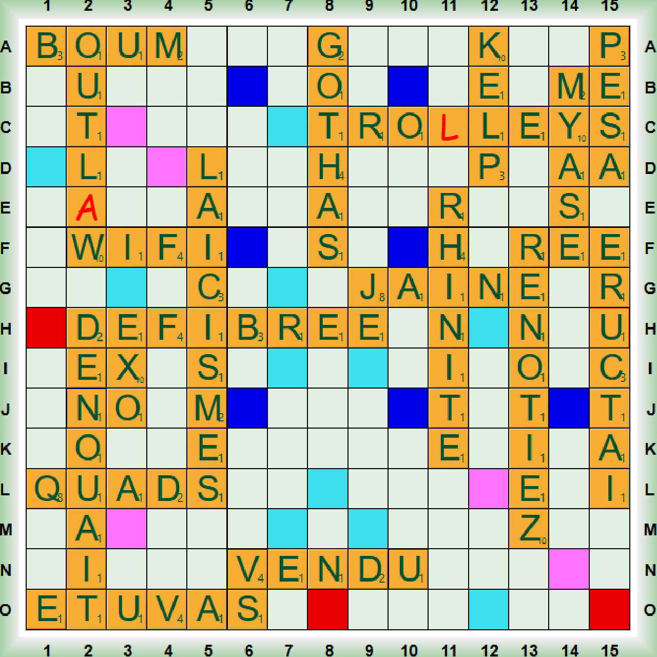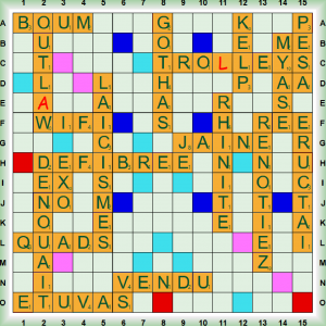 La partie démarre avec FIBRÉE, JAÏNE (JAIN, E = DJAIN, E =JAÏNA = DJAÏNA : n et adj adepte du JAÏNISME = DJAÏNISME =JINISME nm religion de l’Inde visant à conduire au nirvana) et le 1er scrabble RENOTIEZ. Nous jouons RHINITE, MYASE (=MYIASE nf lésion de la peau provoquée par des larves de mouches), le 2ème scrabble LAÏCISME, QUADS et 2 nouveaux scrabbles DENOUAIS et TRO(L)LEYS (TROLLEY nm dispositif permettant la liaison entre un câble conducteur aérien et un véhicule à moteur). Nous poursuivons avec KELP (nm algue brune géante), WIFI, EXO, qui transforme FIBRÉE en DÉFIBRÉE, et le dernier scrabble ÉRUCTAI. Nous terminons avec PESA, GOTHAS (GOTHA nm ensemble de personnalités), ÉTUVAS, VENDU , OUTL(A)W (nm hors-la-loi) et BOUM.