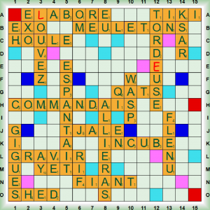 La partie démarre avec un scrabble MANDAIS suivi de QATS et d’un nouveau scrabble ESPANTAI (ESPANTER vt dans le midi, suspendre fortement). Après YÉTI, nous scrabblons avec TORDEUSE (TORDEUR, EUSE n personne qui tord une matière textile – nf petit papillon) et ALLIERAS. Nous jouons WASP (n et adj aux États-Unis, Anglo-Saxon blanc et protestant), 2 nouveaux scrabbles MEULETON (nm petite meule à aiguiser) et É(L)ABORE, RAVIR, COMMANDAIS, EX, GIGUE et SHED (nm toit d’usine en dents de scie). Nous poursuivons avec TIKI (nm statue représentant un dieu polynésien), LOUVEZ (LOUVER vt soulever avec une pince à 2 branches), KSAR (pl KSOUR ou KSARS nm village fortifié au Sahara), FIANT et HOULE. Nous terminons avec TJÄLE (nm partie du sol gelée en hiver), INCUBE (nm démon mâle – INCUBER vt couver, mettre à couver) et FLÉNU (FLÉNU, E adj charbon flambant).