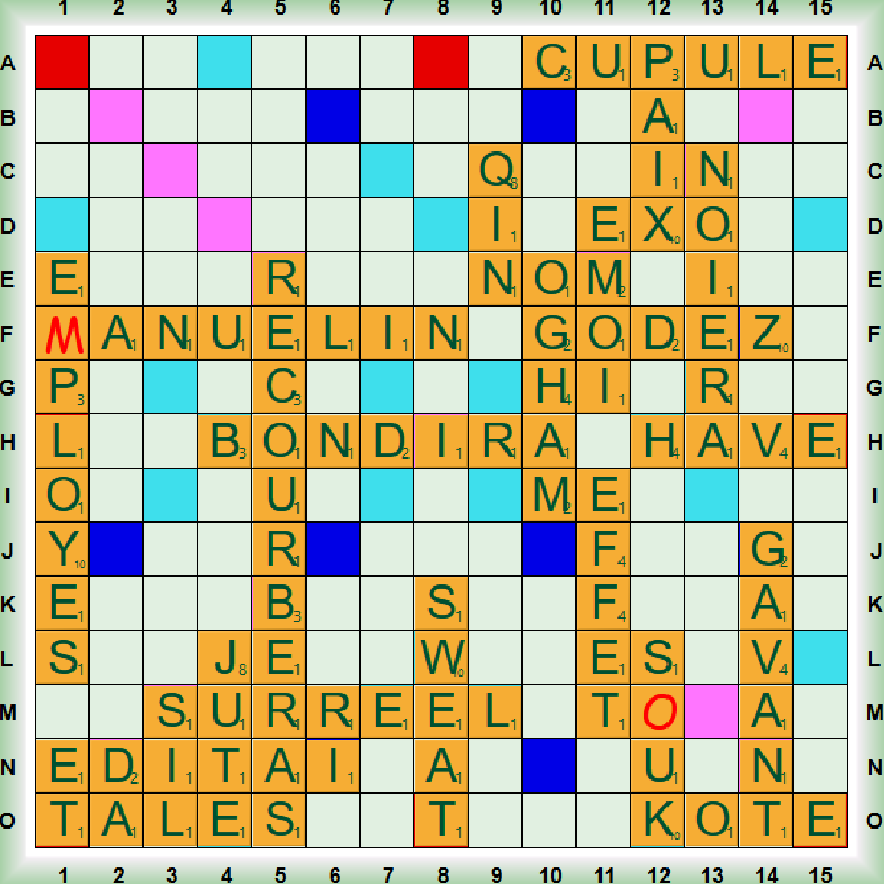 La partie qui un simultané partie normale, démarre avec BONDIR, OGHAM (=OGAM nm la plus ancienne écriture celtique connue), EFFET et les 2 premiers scrabbles RECOURBE et SURRÉEL. Nous jouons SWEAT, JUTE, ÉMOI et les 2 derniers scrabbles (M)ANUÉLIN (MANUÉLIN, E adj style architectural et décoratif complexe du Portugal) et EMPLOYÉS. Nous poursuivons avec PAIX, CUPULE (nf organe enveloppant certains fruits), ÉDITAI, TALES, NOIERA, HÂVE et S(O)UK. Nous terminons avec GODEZ, QIN, KOTE et VASANT (VASER vt queb se couvrir de vase).
