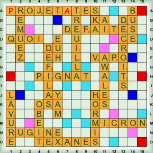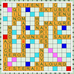 La partie débute par trois scrabbles : TRÉTEAU, MONDIALE et RE(T)AILLE puis MOYES et un autre scrabble ÉPANDONS, puis HURLA qui transforme ÉPANDONS en RÉPANDONS, CYAN, EMPAN (nm. Distance entre le pouce et le petit doigt écartés) et ULVE (nf. Algue verte ou laitue de mer) en collante. Nous posons ensuite SOUFI (=SUFI Adj et nom Adepte d’un courant mystique de l’islam), VETS, FLAIR, ENQUIT (du verbe ENQUÉRIR) et BÉCOTAS. Nous poursuivons avec MANX (nm Race de chats sans queue), HOUIEZ, ZIKR (= DHIKR nm. Prière collective par laquelle les soufis invoquent Dieu), WU et un dernier scrabble RÉGIR(A)IT. La partie s’achève avec JAR (=JARD nm. Sable du fond des rivières), BÊ, IDÉES et GEX.