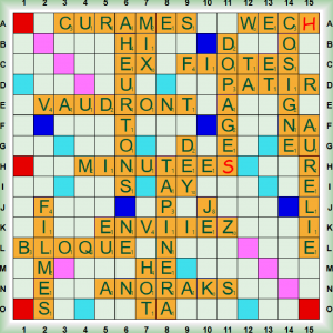 La partie démarre avec VASEUX suivi de 4 scrabbles INSULTA(I), ONDULENT, DANSOTTA (DANSOTTER = DANSOTER ppi) et ENAMOURE (ENAMOURER (S’) vt s’éprendre). Après MOYER (MOYER vt scier une pierre en 2 parties égales), nous scrabblons avec TRACKING (nm traçage d’un produit – analyse comportemental d’un internaute) puis nous jouons HÉBREU, VAPO, WAGON et le dernier scrabble HUMILIER. Nous poursuivons avec FOLK, ERSE (1 nf mar anneau de cordage – 2 adj de la haute Écosse), BIQ(U)EZ et BERTHES (BERTHE nf large col arrondi – bidon à lait). Nous terminons avec DOLAI (DOLER vt amincir le bois), ENFEUS (ENFEU pl ENFEUS ou ENFEUX nm niche funéraire), GICLA et JEEPS.
