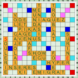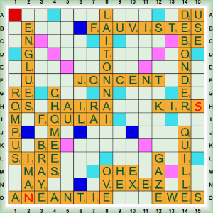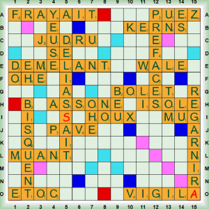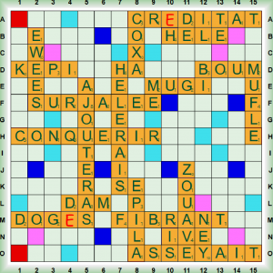 La partie démarre avec QUBIT (nm unité élémentaire de l’informatique quantique), ASPIC (nm vipère, lavande mâle, mets enrobé de gelée), CEDIEZ et le 1er scrabble BUGN(É)ES (BUGNER = BEUGNER vt fam battre, cabosser). Nous jouons EX, UNIV, TZARS, le 2ème scrabble HIERAIS, DRACHME (nf ancienne unité monétaire de la Grèce), et MEUGLAS. Nous poursuivons avec PEKOE (nm thé noir), VIS suivi de 2 scrabbles (B)RANLÉE et SOLDEUSE (SOLDEUR, EUSE n personne qui fait le commerce d’articles en solde) puis WALI (nm fonctionnaire algérien) et le dernier scrabble MONIALE. Nous terminons avec NOYA, HUER, JETON, FERA et POT.