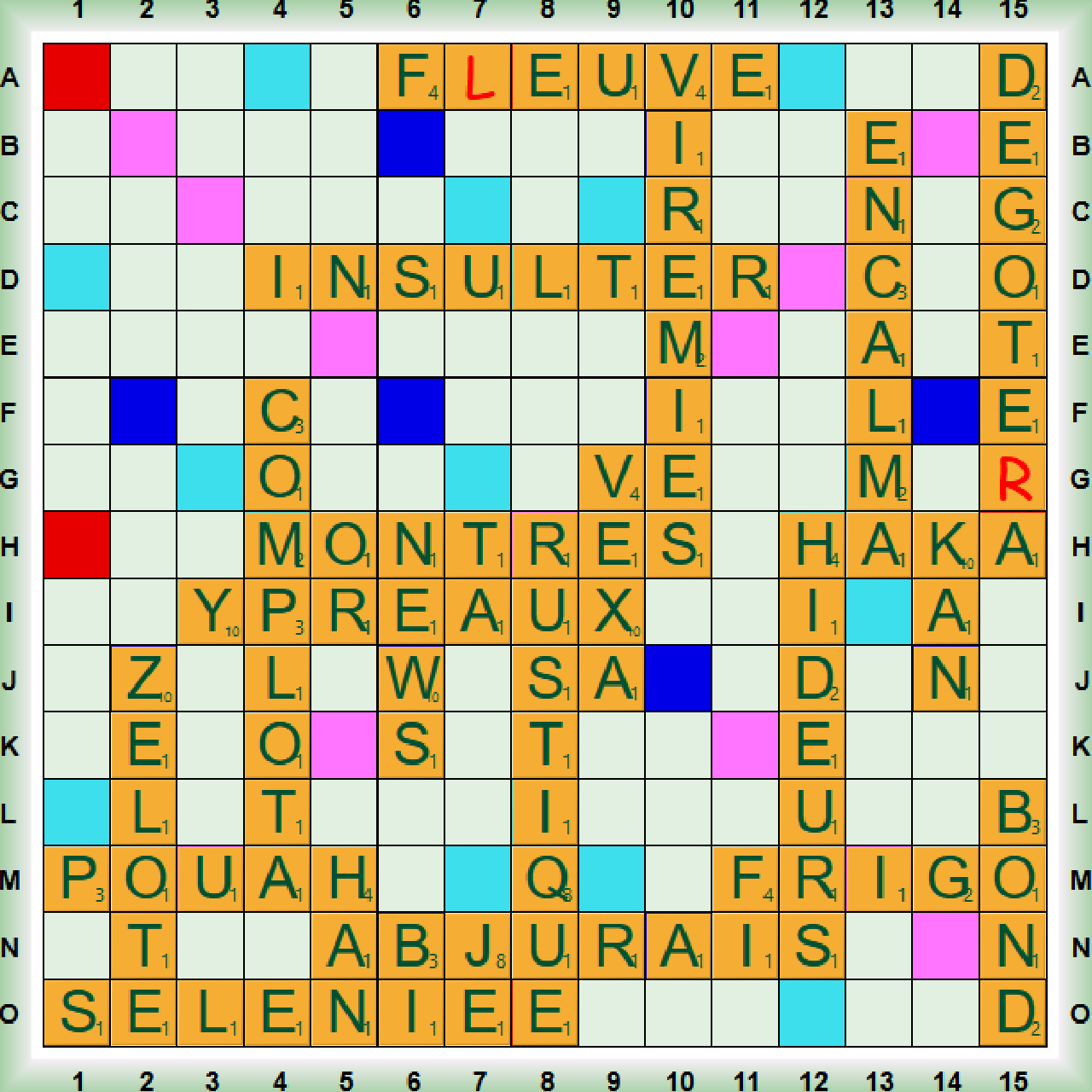 La partie démarre avec VASEUX suivi de 4 scrabbles INSULTA(I), ONDULENT, DANSOTTA (DANSOTTER = DANSOTER ppi) et ENAMOURE (ENAMOURER (S’) vt s’éprendre). Après MOYER (MOYER vt scier une pierre en 2 parties égales), nous scrabblons avec TRACKING (nm traçage d’un produit – analyse comportemental d’un internaute) puis nous jouons HÉBREU, VAPO, WAGON et le dernier scrabble HUMILIER. Nous poursuivons avec FOLK, ERSE (1 nf mar anneau de cordage – 2 adj de la haute Écosse), BIQ(U)EZ et BERTHES (BERTHE nf large col arrondi – bidon à lait). Nous terminons avec DOLAI (DOLER vt amincir le bois), ENFEUS (ENFEU pl ENFEUS ou ENFEUX nm niche funéraire), GICLA et JEEPS.