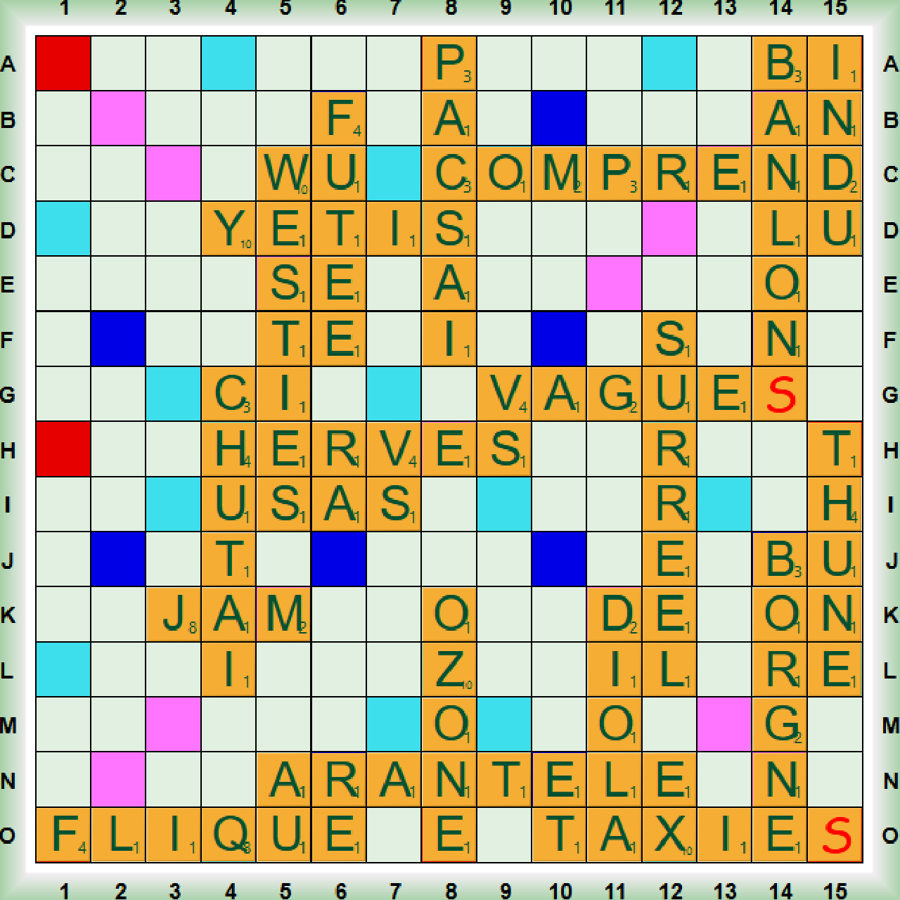La partie débute par trois scrabbles : TRÉTEAU, MONDIALE et RE(T)AILLE puis MOYES et un autre scrabble ÉPANDONS, puis HURLA qui transforme ÉPANDONS en RÉPANDONS, CYAN, EMPAN (nm. Distance entre le pouce et le petit doigt écartés) et ULVE (nf. Algue verte ou laitue de mer) en collante. Nous posons ensuite SOUFI (=SUFI Adj et nom Adepte d’un courant mystique de l’islam), VETS, FLAIR, ENQUIT (du verbe ENQUÉRIR) et BÉCOTAS. Nous poursuivons avec MANX (nm Race de chats sans queue), HOUIEZ, ZIKR (= DHIKR nm. Prière collective par laquelle les soufis invoquent Dieu), WU et un dernier scrabble RÉGIR(A)IT. La partie s’achève avec JAR (=JARD nm. Sable du fond des rivières), BÊ, IDÉES et GEX.