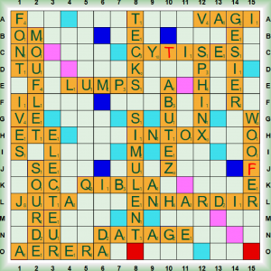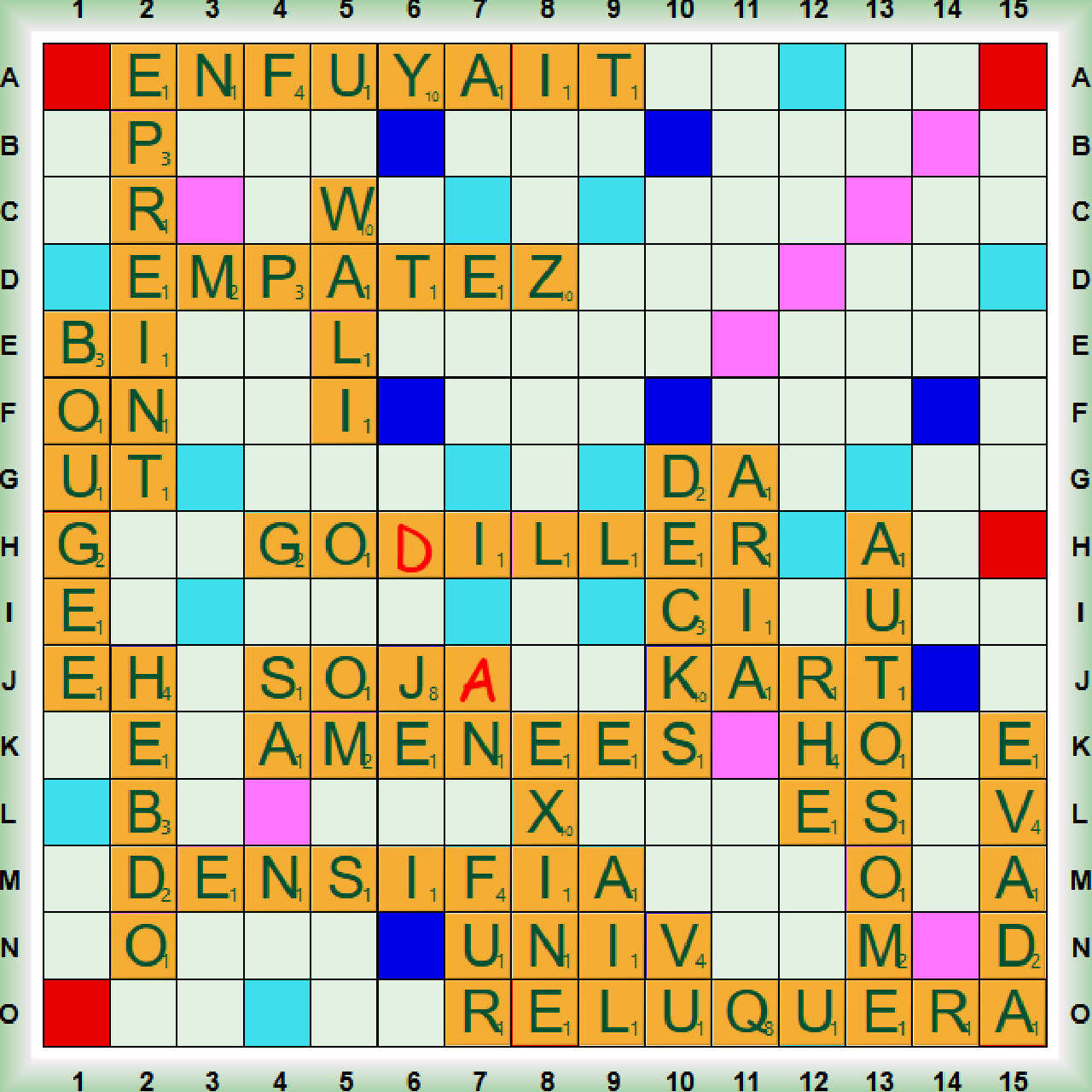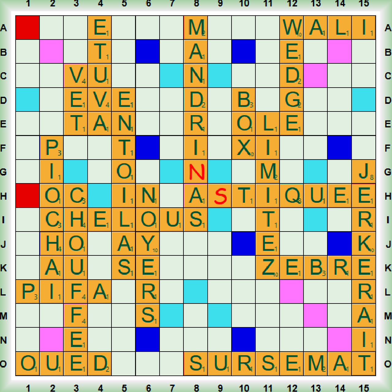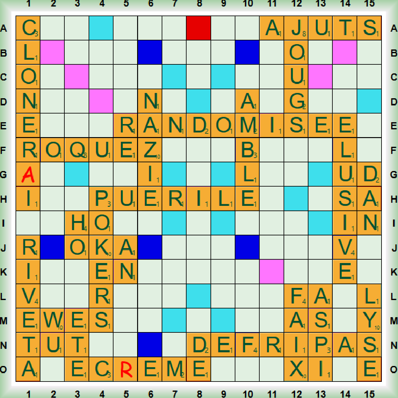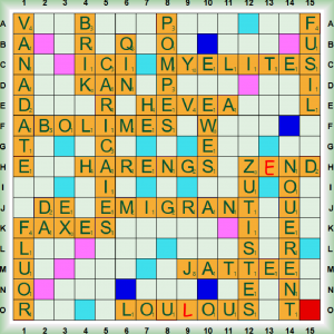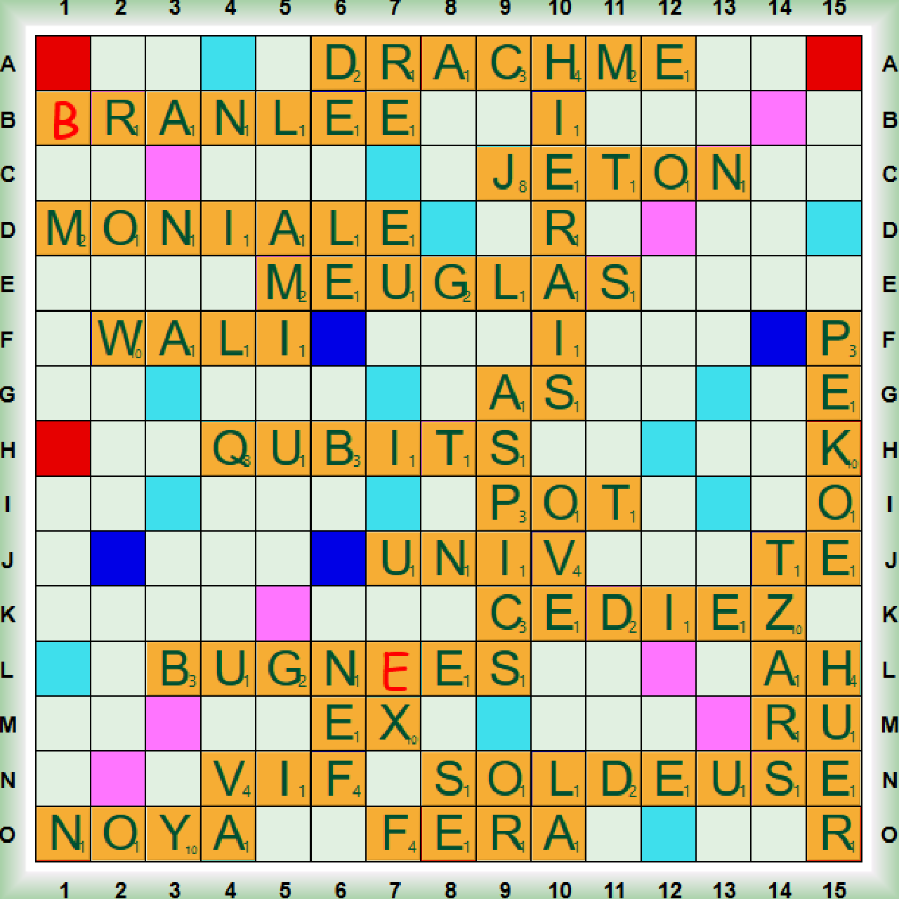 La partie démarre avec QUBIT (nm unité élémentaire de l’informatique quantique), ASPIC (nm vipère, lavande mâle, mets enrobé de gelée), CEDIEZ et le 1er scrabble BUGN(É)ES (BUGNER = BEUGNER vt fam battre, cabosser). Nous jouons EX, UNIV, TZARS, le 2ème scrabble HIERAIS, DRACHME (nf ancienne unité monétaire de la Grèce), et MEUGLAS. Nous poursuivons avec PEKOE (nm thé noir), VIS suivi de 2 scrabbles (B)RANLÉE et SOLDEUSE (SOLDEUR, EUSE n personne qui fait le commerce d’articles en solde) puis WALI (nm fonctionnaire algérien) et le dernier scrabble MONIALE. Nous terminons avec NOYA, HUER, JETON, FERA et POT.