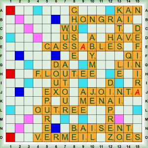 La partie démarre avec FLOUTE, ABYME (EN ABYME loc invariable œuvre littéraire incluse dans une œuvre de même nature) et le 1er scrabble CASS(A)BLE. Nous jouons CHUSSE, DOUX, HAVE (HAVER vt min découper parallèlement aux strates), ÉPURÉE et VERMEIL. Nous poursuivons avec WUS, DÉFINIR, JOINT(A) (JOINTER vt tech assembler), HONGRAI (HONGRER vt châtrer un cheval) et le 2ème scrabble BAISENT. Nous continuons avec DIAPREZ (DIAPRER vt parer de couleurs variées), KAN, QI, MENAI et ZOÉS (ZOÉ nf forme larvaire de certains crustacés). Nous terminons avec KATAS (KATA nm dans les arts martiaux, succession codifiée de prises), AUTOUR (nm oiseau de proie – adv), OUTRÉE, AJOINTA (AJOINTER vt joindre bout à bout) et LE.
