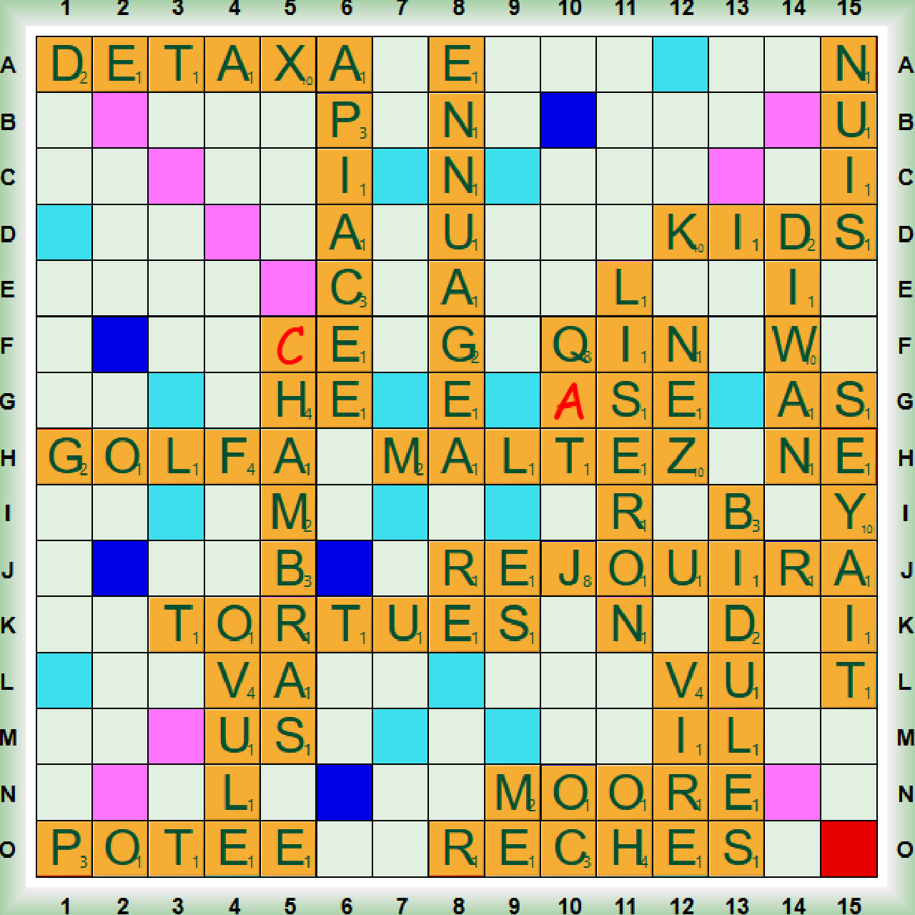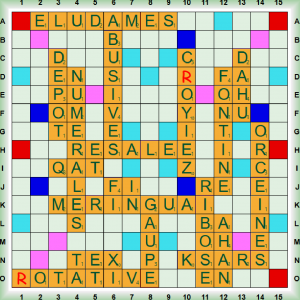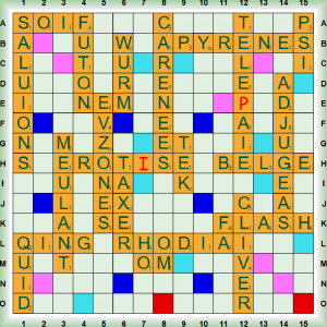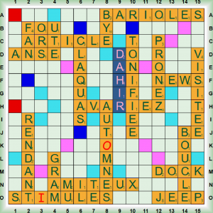 La partie démarre avec RESALE, QAT et les 2 premiers scrabbles NUMÉRALE et C(R)OYIEZ. Après DÉPÔT, nous enchainons 3 scrabbles MERINGUA, ABUSIVES et ÉLUDÂMES. Nous jouons RIBOSE (nm chim sucre), KSARS (KSAR, pl KSOUR ou KSARS, nm village fortifié au Sahara), GAUPE (nf vx femme de mauvaise vie) et le 6ème scrabble FONTINE (=FONTINA nf fromage du Val d’Aoste en Italie). Nous poursuivons avec FI, DAHU, et les 2 derniers scrabbles (R)OTATIVE (ROTATIF, IVE adj qui agit en tournant – ROTATIVE : presse à imprimer) et ORCÉINES (ORCÉINE nf colorant rouge extrait de l’orseille) puis nous terminons avec TEX et AHAN.
