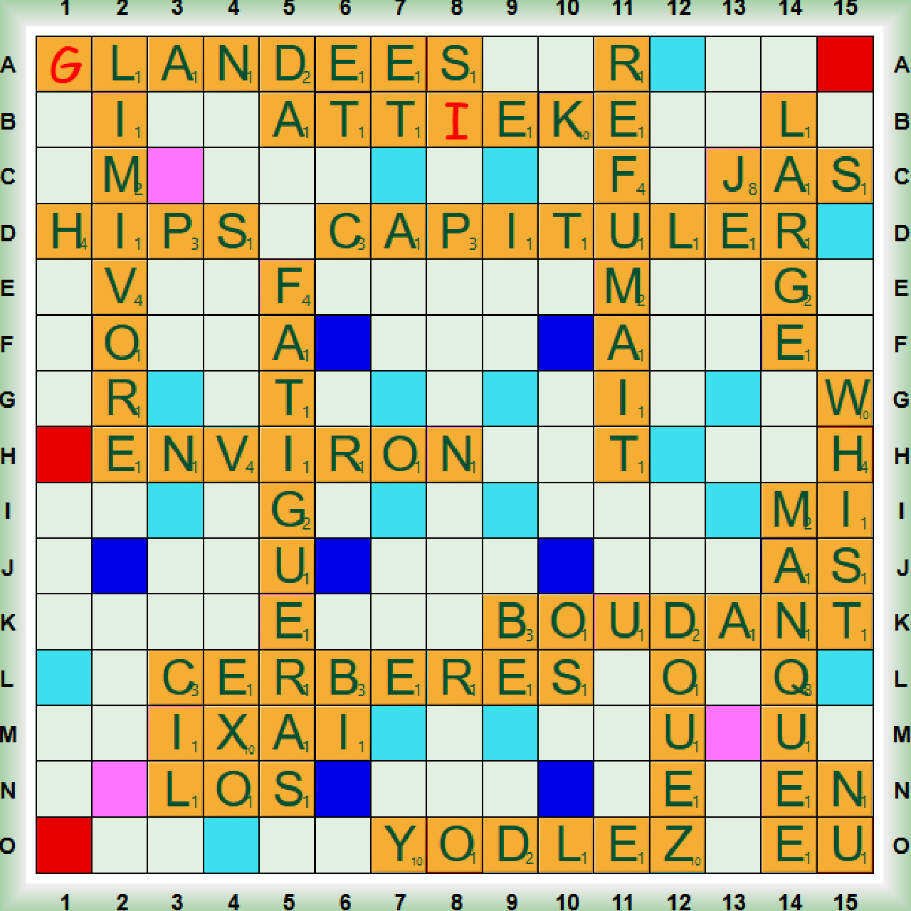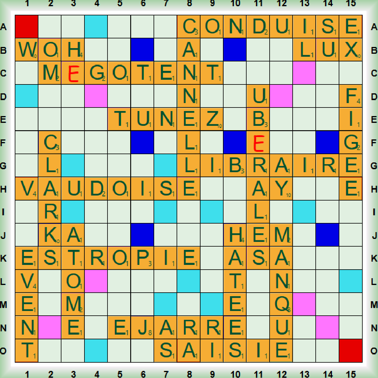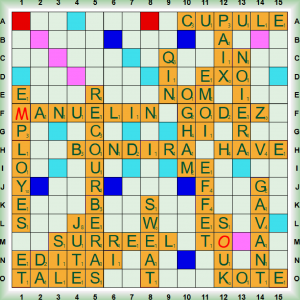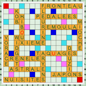 La partie, disputée dans le cadre des simultanés fédéraux, débute par deux scrabbles AUDOISE (Adj Habitante de l’Aude) et CANNELLE (nf Ecorce aromatique utilisée pour l’alimentation, mais aussi du verbe CANNELER: Orner de cannelures). Nous jouons ensuite CLARKS (Nom déposé: Engin de levage ou de traction) et TUNEZ avant un nouveau scrabble CONDUISE. Nous poursuivons avec LUX en collante puis deux nouveaux scrabbles LIBRAIRE et UB(É)RALES (adj fém. Se dit d’une fontaine ornée de statues de femmes dont les seins font jaillir l’eau). Nous posons ensuite AY et FIGÉE avant les deux derniers scrabbles M(É)GOTENT et ESTROPIE, puis HÂTEE, ÉJARRE (du verbe ÉJARRER Débarrasser une fourrure de ses poils raides) et SAISIE en collante. AUDOISE est transformée en VAUDOISE (adj Habitante du canton de Vaud, en Suisse) puis la partie s’achève avec WOH, MANQUE, ATOME et ÉVENT.