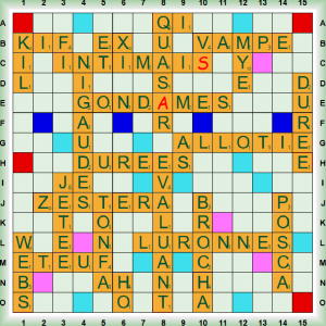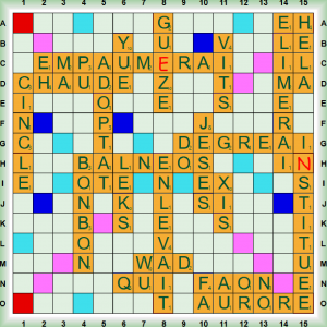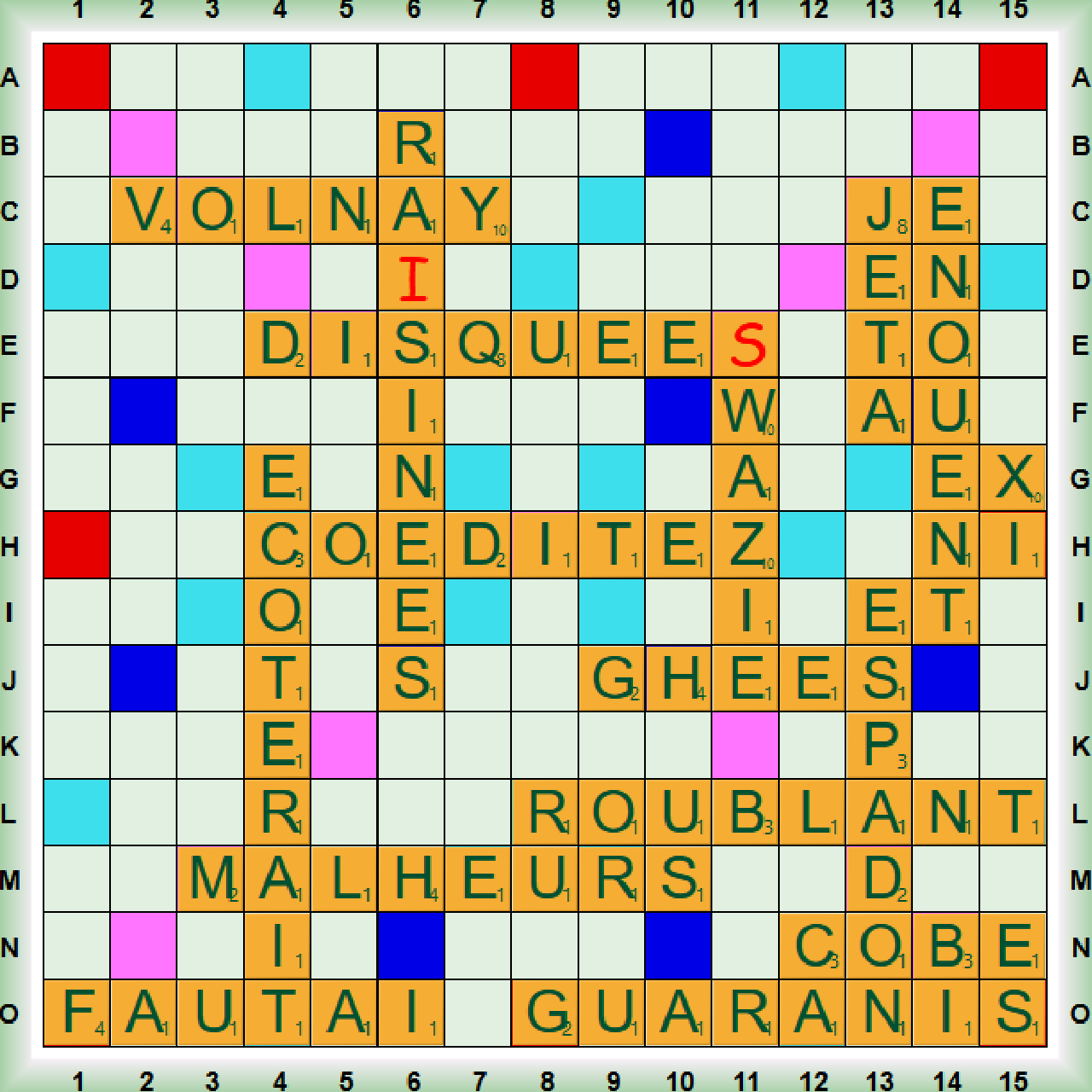 La partie démarre avec un scrabble COÉDITE suivi de (S)WAZI (SWAZI, E adj du Swaziland en Afrique australe) et de GHEE (=GHI nm beurre clarifié utilisé dans la cuisine indienne). Nous enchainons 5 scrabbles ESPADON, DISQUÉES (DISQUER vt découper à la disqueuse), GUARANIS (GUARANI, E adj du Paraguay – langue – Monnaie du Paraguay), ÉCÔTERAI et MALHEURS. Nous jouons FAUTAI, COBE (=COB = KOB nm antilope d’Afrique), le 7ème scrabble ÉNOUENT puis JETA. Nous terminons avec 2 scrabbles ROUBLANT et RA(I)SINÉES (RAISINÉE nf helv vin cuit mais RAISINÉ confiture de jus de raisin) suivis de VOLNAY (nm vin de Bourgogne) et XI.