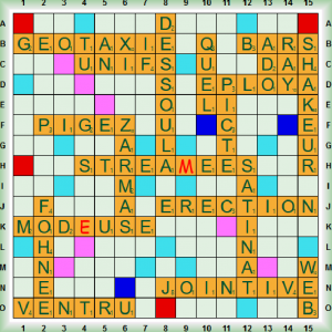 La partie démarre avec un scrabble (C)ASERNE suivi de YET qui transforme CASERNE en CASERNÉE (CASERNER vt loger dans une caserne), du 2ème scrabble CONTOURE (CONTOURER vt définir le contour de quelque chose) puis de VAUDOUE (VAUDOU, E nm et adj culte animiste pratiqué aux Antilles), QI et le 3ème scrabble LOCATIVE. Après GEEKER (ppi passer son temps sur ordinateur), nous scrabblons avec IMPÉTRAT (IMPÉTRER vt dr obtenir à la suite d’une demande) puis nous jouons WOH, BAU, HIÈBLE (=YEBLE nf petit sureau à baies noires), LIS(E)UR, ZUP et le dernier scrabble ÉLIASSE. Nous terminons avec JEAN, FANS, ADIANTE (nm variété de fougère), FLAG, FUMETS, COXE (COXER vt afr appréhender, arrêter) et QIBLA (nf direction de la Mecque).
