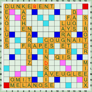 La partie démarre avec FRAPES (FRAPE = FRAPPE nf fam voyou) suivi de 2 scrabbles COUGNAI (COUGNER vt helv coincer, serrer) et SIROTER suivis de FUYANTE, NARRIEZ et le 3ème scrabble CEIN(D)RAIS. Nous jouons LARGE, KACHE (=KACHA nf plat populaire russe), DUNKE (DUNKER ppi effectuer un DUNK – smash au basketball). QIS, AVEUGLE et les 2 dernier scrabbles MÉLANOSE (nf med accumulation de mélanine dans les tissus) et DÉVOLUES. Nous terminons avec MIEUX, DAOS (DAO = TAO nm principe suprême de la pensée chinois), OMIT et DUNKÈ(R)ENT.