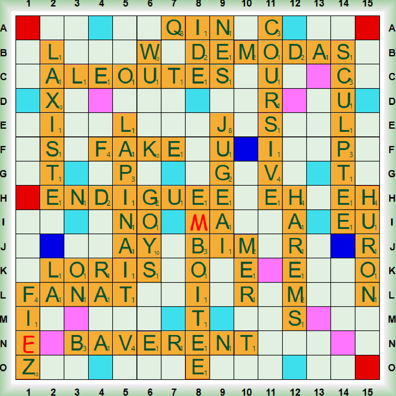 La partie débute par un scrabble ENDIGUE suivi de LAXISTE, LAPINAI (du verbe LAPINER : Mettre bas, en parlant de la lapine) et deux scrabbles ALÉOUTES (nm. et adj. Langue de l’Alaska ou des îles Aléoutiennes) et DÉMODAS. Nous posons ensuite WU, FANÂT et un autre scrabble COURSIVE. Nous jouons HAREMS, un scrabble E(M)BOITÉE, GOY avant deux autres scrabbles BAVÈRENT et SCULPTÉE. Nous poursuivons avec QIN, FAKE (nm. Faux profil ou faux document, sur internet), LORIS (pluriel de LORI, nm. Petit perroquet ou nm. Primate nocturne de l’Inde) et FI(E)Z pour terminer avec HURON (nm et adj : Grossier, malotru ou Amérindien du Canada), JUGEAI et MER qui forme BIM (Interjection).