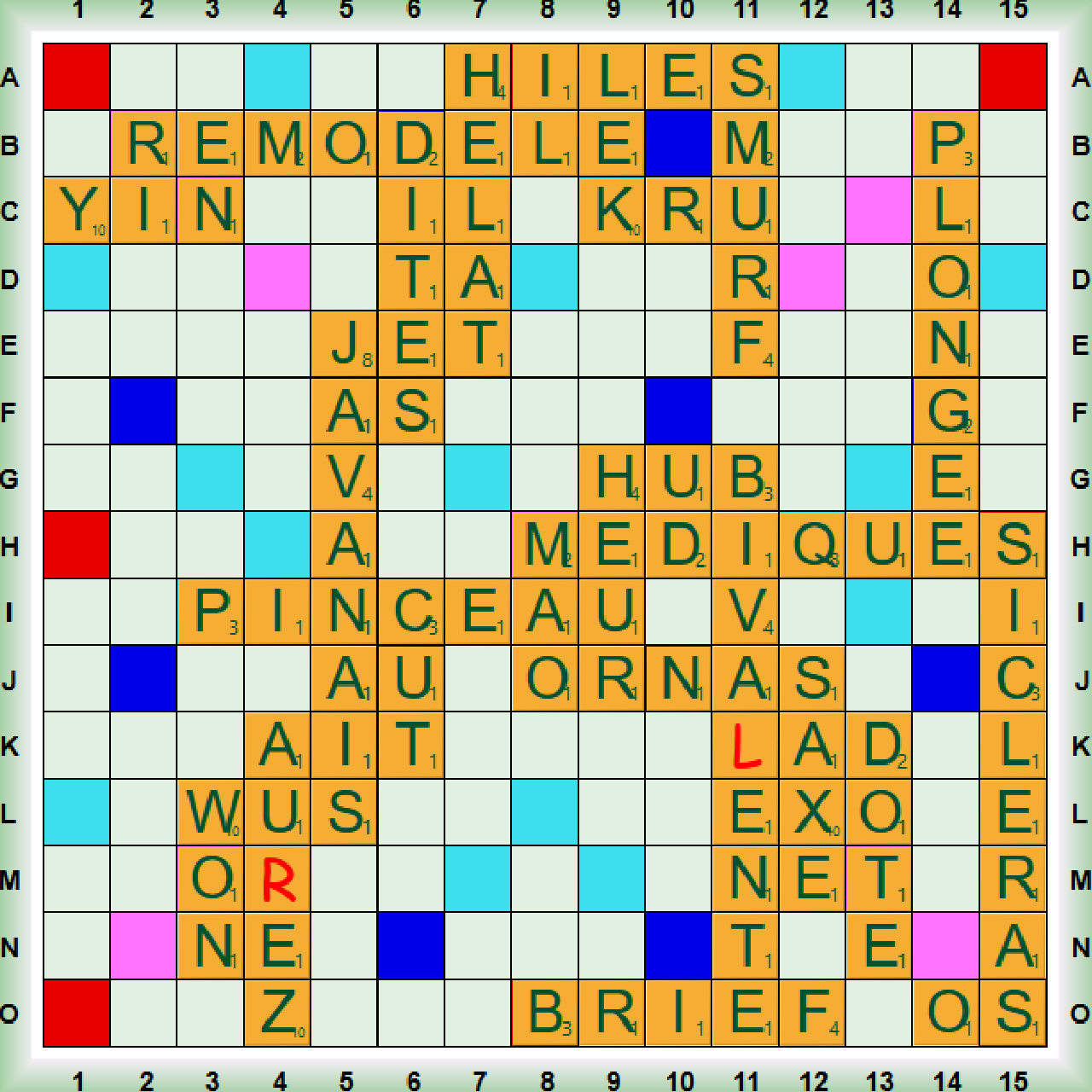 La partie démarre avec COKES, XI, WOK et le 1er scrabble COUTUR(A)I (COUTURER vt couvrir de cicatrices). Nous jouons DRAINEZ, HÉ, VÉDA (nm ensemble des textes littéraires de l’Inde), BORÉE (nm antiq grec vent du nord), HIE, TUAS, AMYLE (nm radical hydrocarboné) et le 2ème scrabble FERMAGES. Nous poursuivons avec JEAN, JURAT (verbe JURER mais également JURAT nm médiev magistrat municipal) suivi de 3 nouveaux scrabbles RÉOUVRIT, EMPILAS et BÉDANES (BÉDANE nm burin étroit). Nous terminons avec PITOU(S) (PITOU nm queb chien – terme affectueux), IF, RÉOUVRITES et CE.