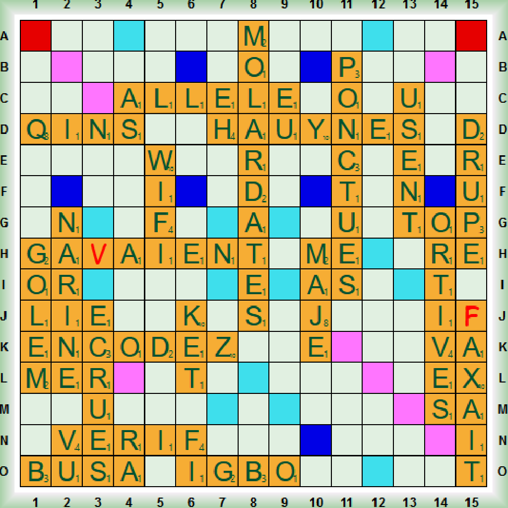 La partie débute par un scrabble A(V)AIENT que l’on précède d’un G en posant GOLEM (nm. Dans la tradition juive, automate pouvant être doué de vie). Nous jouons ensuite NARINE en collante, WIFI, ENCODEZ, ÉCRU et un nouveau scrabble LARDÂTES. Nous posons HAÜYNE (nf. Aluminosilicate de sodium), VÉRIF, IGBO (=IBO: Adj. D’un peuple du Nigéria), USENT et un nouveau scrabble PONCTUES. Nous transformons LARDÂTES en MOLARDÂTES (du verbe MOLARDER (= MOLLARDER (ppi): Cracher) puis enchaînons avec MAJE (adj m. Hist: Juge maje = Lieutenant du sénéchal), BUSA (du verbe belge BUSER: Recaler à un examen), ALLÈLE (adj et nm. Caractère héréditaire qui s’oppose à un autre) et KET. Nous terminons la partie avec un dernier scrabble ORTIVES (adj. f. Amplitude ortive: arc de l’horizon entre la direction de l’est et celle d’une étoile à son lever), suivi de AXA, DRUPE ( n.f. Bot. Fruit charnu à noyau), (F)AXAIT et QINS.