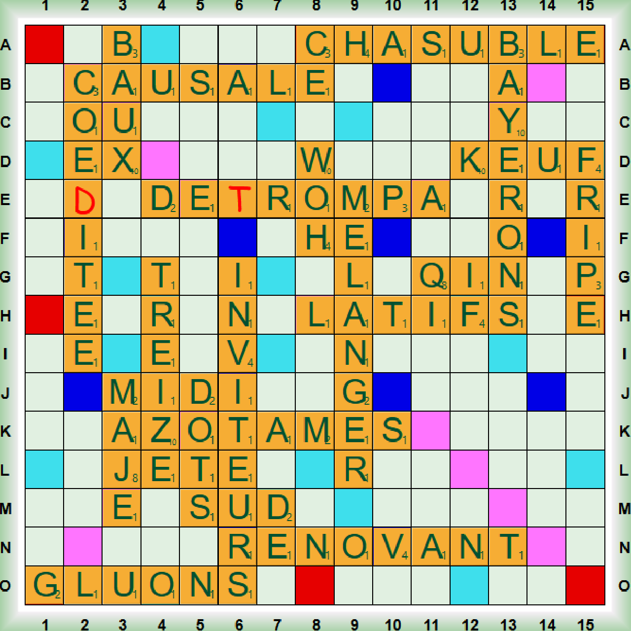 La partie démarre avec un scrabble LATIFS (LATIF nm ling cas indiquant la direction ou le but) suivi de 4 scrabbles BAYERONS, CHASUBLE (nf vêtement liturgique), MÉLANGER et AZOTÂMES. Nous jouons TREIZE, KEUF, le 4ème scrabble INVITEUR puis QIN, FRIPE, GLUONS, WOH et 2 nouveaux scrabbles RÉNOVANT et CAUSALE (CAUSAL, E pl CAUSALS ou CAUSAUX adj qui indique un rapport de cause à effet). Après DÉ(T)ROMPA, nous jouons le dernier scrabble COÉ(D)ITÉE et nous terminons avec BAUX, MAJE, DOTS et SUD.