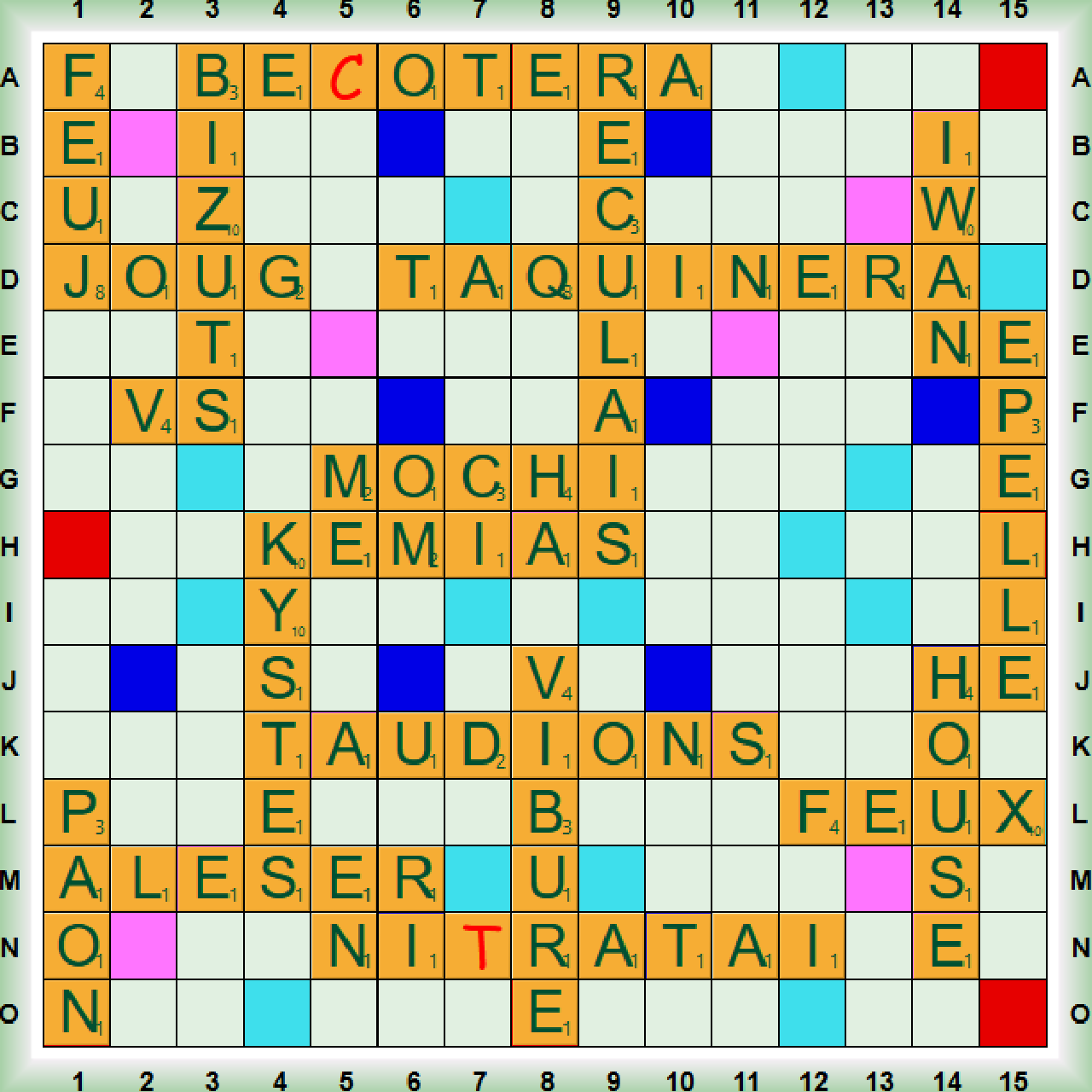 La partie démarre avec KÉMIA (nf amuse-gueule nord-africain) suivi de 2 scrabbles ÉCULAIS et TAQUINER puis de IWAN (nm salle vouée de certaines mosquées), ÉPELLE, KYSTE et HOUSE (nf musique populaire). Nous enchainons 2 scrabbles TAUDIONS (TAUDER vt couvrir d’un TAUD = TAUDE abri en grosse toile) et É(C)ÔTERA (ÉCÔTER vt débarrasser les feuilles de tabac de leurs côtes) qui forme RECULAIS puis nous jouons LÉSER, VIBURE (nf invariable à toute vibure = à toute vitesse), PAON, MOCHI (nm pâtisserie à base de riz gluant) et le dernier scrabble NI(T)RATAI. Nous terminons avec FEUX, BIZUT qui forme BÉCOTERAS, VS, JOUG et FEUJ.