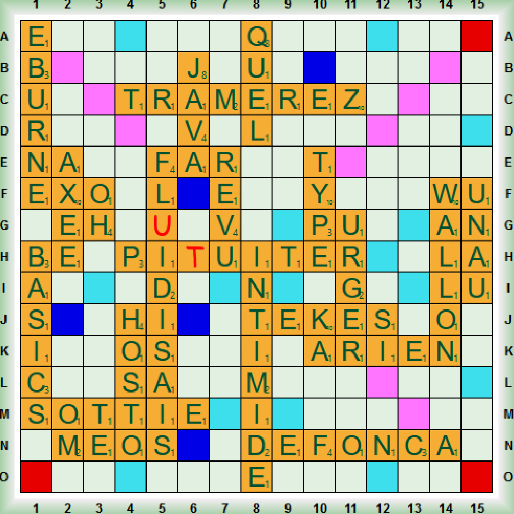 La partie, jouée en 2 min/coup débute par un scrabble PITUITE (nf. Vomissement glaireux ou verbe PITUITER : Crier, en parlant de la caille), puis TYPE et deux autres scrabbles FLUIDISA et INTIMIDE. Nous poursuivons avec SOTTIE (=SOTIE : nf Litt. Farce satirique médiévale), BASICS (nm. Langage informatique), MÉOS (adj. D’un peuple de l’Asie du Sud-Est), TÉKÉS (adj. D’un peuple du Congo et du Gabon) puis URGE (du verbe URGER verbe défectif donc peu conjugué en dehors de la troisième personne), HOSTO en collante, JAVA et ARIEN (n. et adj. Hérétique partisan de la doctrine d’Arius -IVe s.). Nous jouons ensuite WALLON (Adj et nom masculin mais WALLONNE : De la Wallonie), UNAU (nm. Mammifère arboricole d’Amérique tropicale) en collante, puis un nouveau scrabble TRAMEREZ et ÉBURNÉ (=ÉBURNÉEN adj. Qui a les caractères de l’ivoire). La partie s’achève avec QUEL, OH et REVU qui forme FAR.