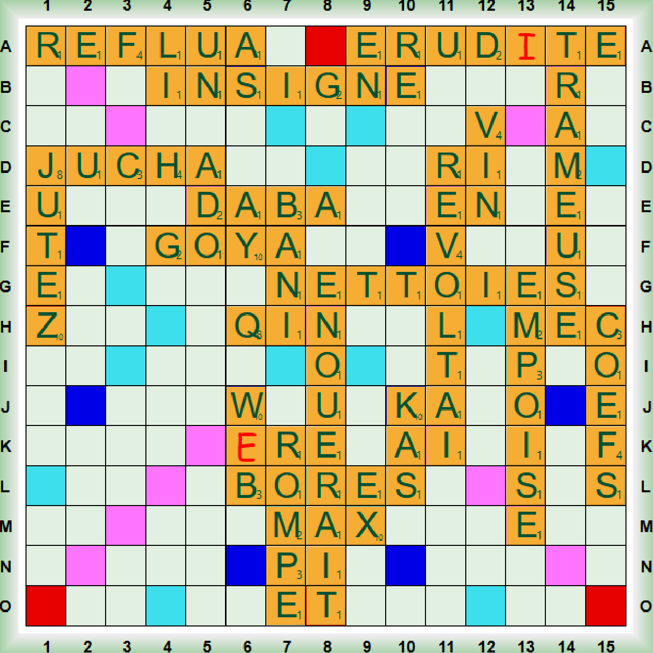 La partie qui est simultané fédéral partie normale démarre avec QIN, le 1er scrabble NETTOIE, GOYA (nm récompense cinématographique en Espagne) et 2 nouveaux scrabbles RÉVOLTAI et ÉNOUERAIT. Après ROMPE, nous scrabblons avec RAMEUSE et ÉRUD(I)TE qui transforme RAMEUSE en TRAMEUSE (TRAMEUR, EUSE text ouvrier qui dispose les fils de trame). Nous jouons DABA (nf afr houe à manche court) qui forme BANI (BAN pl BANS ou BANI nm unité monétaire de la Roumanie), EMPOISE (nf, pièce d’un laminoir), COEFS et le dernier scrabble INSIGNE. Nous poursuivons avec KAS, REFLUA, EX, JUCHA et nous terminons avec JUTEZ, W(E)B et VIN