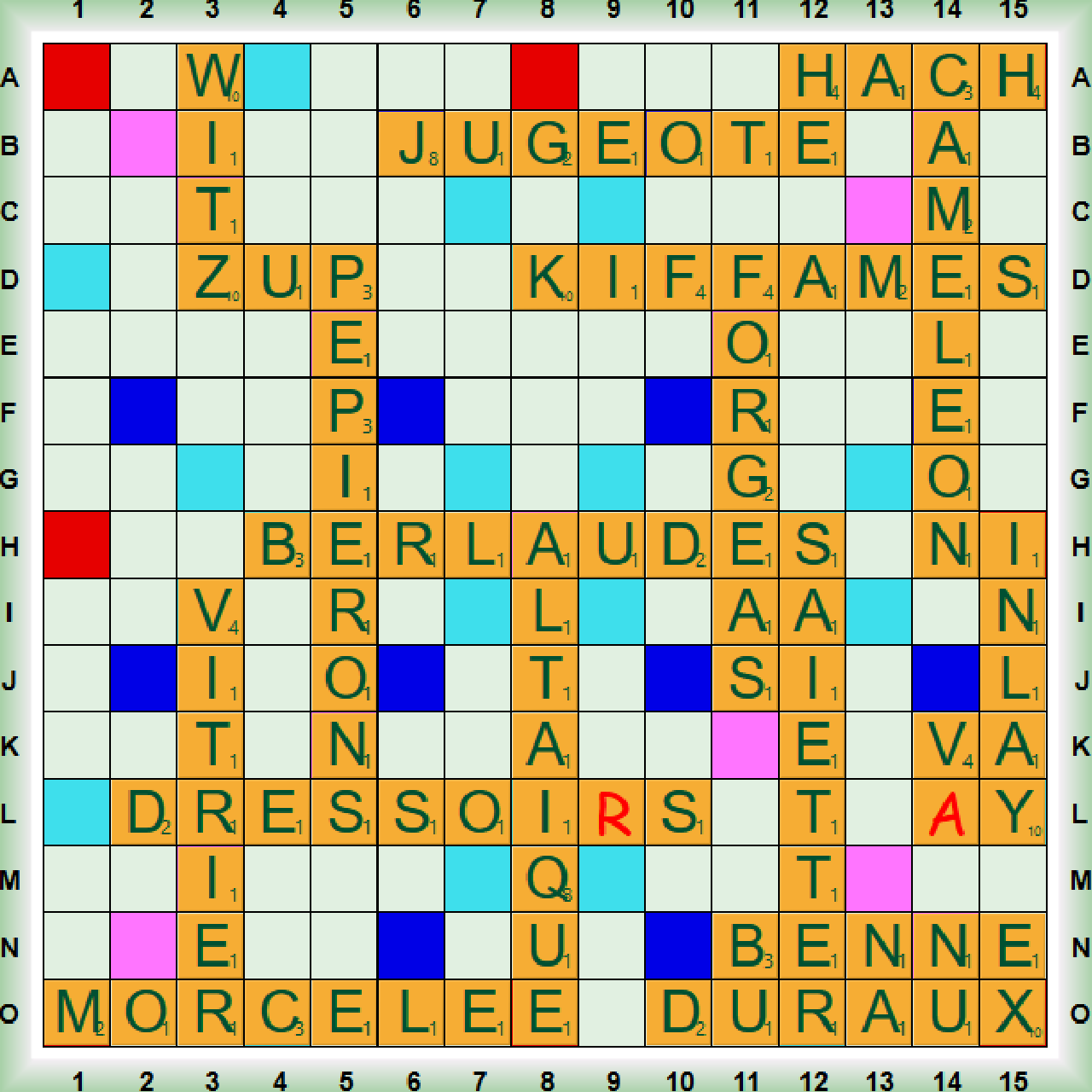 La 2ème partie qui est un simultané fédéral partie joker, commence par une série de 8 scrabbles : BERLAUD (aj. et n. Fam Nigaud) , FORGEAS, ÉPIERONS, ALTAÏQUE (adj. Des monts Altaï en Asie Centrale), SAIETTE (du verbe SAIETTER : Nettoyer avec une saie, une petite brosse d’orfèvre) , KIFFÂMES (du verbe KIFFER = KIFER : Fam. Apprécier), MORCELÉE et CAMÉLÉON. Nous jouons ensuite INLAY et DURAUX (pluriel de DURAL, adjectif relatif à la dure-mère, méninge externe) avant un nouveau scrabble DRESSOI(R)S. Nous poursuivons avec HACH (=HASCH : Hachich) avant un dernier scrabble JUGEOTE. La partie s’achève avec BENNE en collante, VITRIER, ZUP qui forme PÉPIERONS, du verbe PÉPIER: Pousser des petits cris, en parlant des jeunes oiseaux) , WITZ (nm. Helv. Plaisanterie) et V(A).