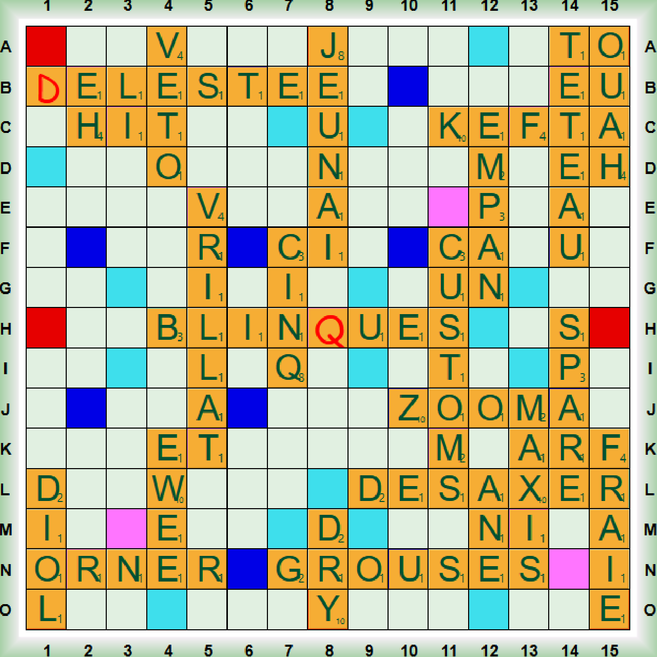 La partie démarre avec un scrabble BLIN(Q)UE (BLINQUER vt belg astiquer, faire briller) suivi de CUSTOM (nm véhicule personnalisé extérieurement), EMPAN (nm distance entre le pouce et le petit doigt écartés), KEFTA (nf boulette de viande hachée) et DÉSAXÉ. Nous jouons FRAIE (FRAYER vt), NI, OUAH, ZOO, VRILLÂT et le 2ème scrabble GROUSES (GROUSE nf oiseau des montagnes d’Écosse). Nous poursuivons avec TÉTEAU (TÉTEAU, X nm bot extrémité d’une branche maîtresse), CINQ, MAXIS, SPARE (nm au bowling, action de renverser toutes les quilles avec 2 boules), JEÛNAI, ORNER, DRY et DIOL (nm chim corps qui a 2 fonctions alcool). Nous terminons avec un scrabble (D)ÉLESTÉE suivi de HIT et VÉTO.
