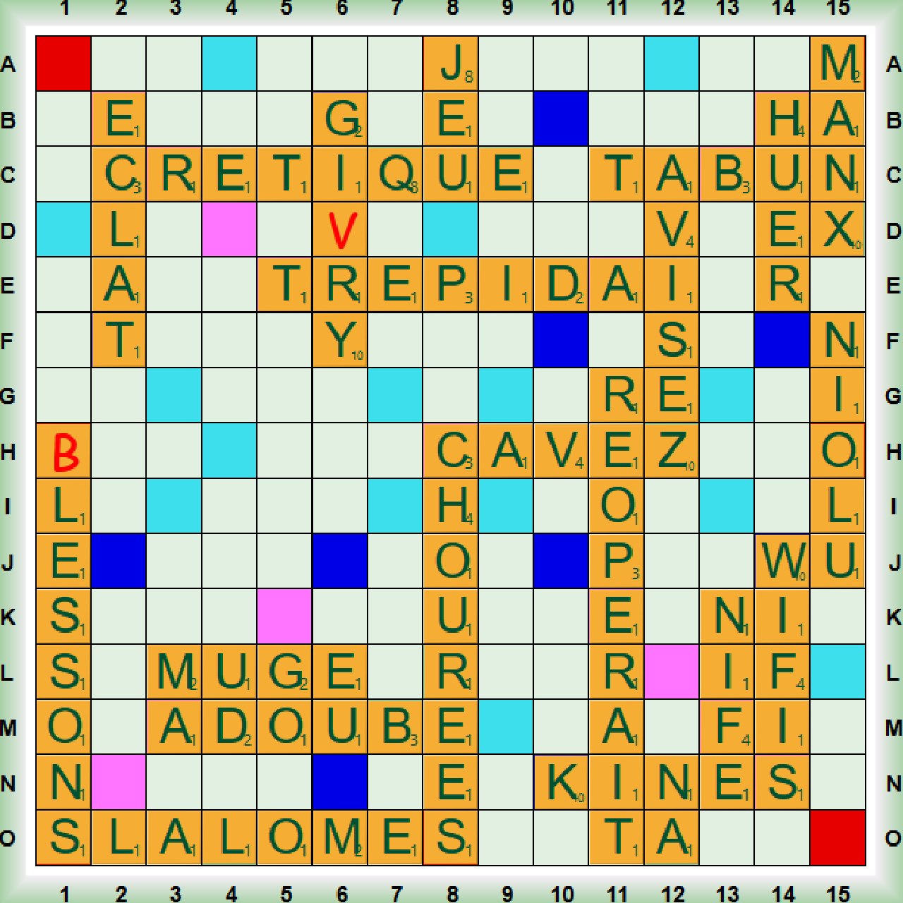 La 2ème partie qui est jouée en 2 minutes 30, démarre avec CAVEZ, VISEZ, TABUN (nm gaz de combat), MANX (nm race de chat sans queue) et les 4 premiers scrabbles TRÉPIDAI, RÉOPÉRAI, CHOURÉES (CHOURER vt arg voler) et SLALOMES. Nous jouons KINÉS, WIFIS et le 5ème scrabble (B)LESSONS. Nous poursuivons avec NIOLU (adj et n helv niais, sot), GI(V)RY (GIVRY nm vin de Bourgogne), RÉTIQUE (=RHÉTIQUE adj et nm de Rhétie, région des Alpes centrales), JEU, HUER et NIFE (=NIF nm noyau hypothétique de la terre, formé de nickel et de fer). Nous terminons avec ADOUBE, ÉCLAT qui transforme RÉTIQUE en CRÉTIQUE (nm poésie, pied formé d’une brève entre 2 longues), MUGE (nm poisson marin) et TA.