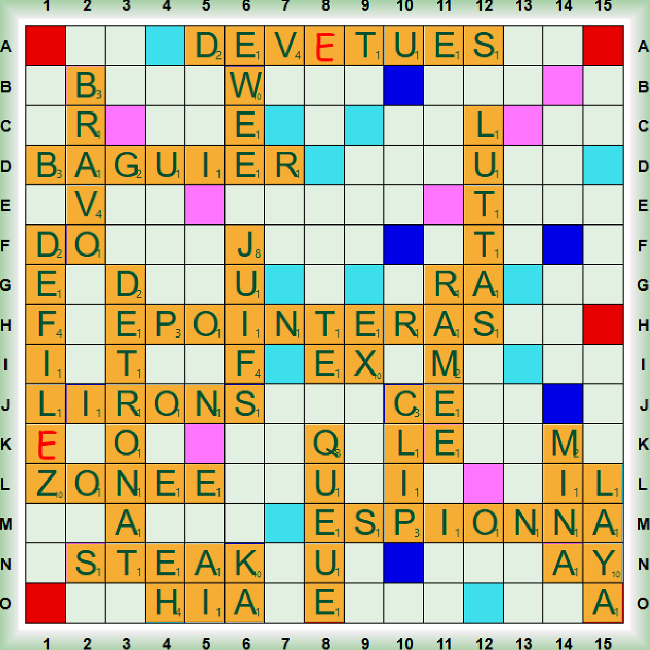 La partie débute par un scrabble POINTER suivi de RAMÉE (nf. Litt Ensemble de branches entrelacées), CLIP et un scrabble ESPIONNA. Nous jouons ensuite QUEUE, LAYA, JUIF, MINA et EX. Nous poursuivons avec LUTTAS, LIRONS, DÉFIL(E)Z, DÉTRÔNA qui transforme le verbe POINTER en ÉPOINTER (Émousser), STEAK et HIA en collante. Nous posons ensuite ZONÉE (adj. mais aussi du verbe transitif ZONER = Partager des informations en portions homogènes), BRAVO, BAGUIER (nm. Coffret à bagues), ÉWÉE et terminons par un scrabble DÉV(Ê)TUES.