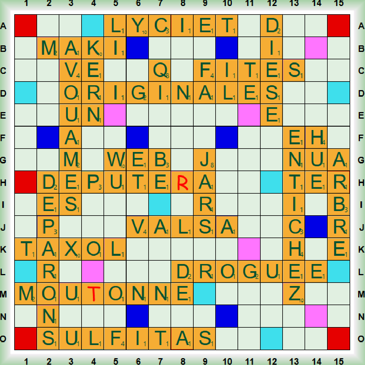 La partie, jouée dans le cadre des simultanés fédéraux, débute par un scrabble DÉPUTE(R) (Envoyer en mission) suivi de WEB et un nouveau scrabble DÉPARONS (Enlaidir, gâter) puis VOUÂMES. Nous jouons deux autres scrabbles : MOU(T)ONNE (Adjectif et nom, mais aussi du verbe MOUTONNER) et SULFITAS (du verbe SULFITER : Additionner d’anhydride sulfureux). Nous posons KERN (nm En Belgique, conseil ministériel restreint) puis un scrabble ORIGINALE suivi de DIÈSE, FÎTES et MAKI (nm. Primate à longue queue – Sorte de sushi) formant AVOUÂMES. Nous poursuivons avec deux derniers scrabbles DROGUÉE et ENTICHEZ puis LYCIET (nm. Arbrisseau produisant des gojis), HUE et ARBRE. La partie s’achève avec TAXOL (nm. Substance extraite notamment de l’if, et utilisée en chimiothérapie), JAR (=JARD nm. Sable du fond des rivières), VALSA et QI.