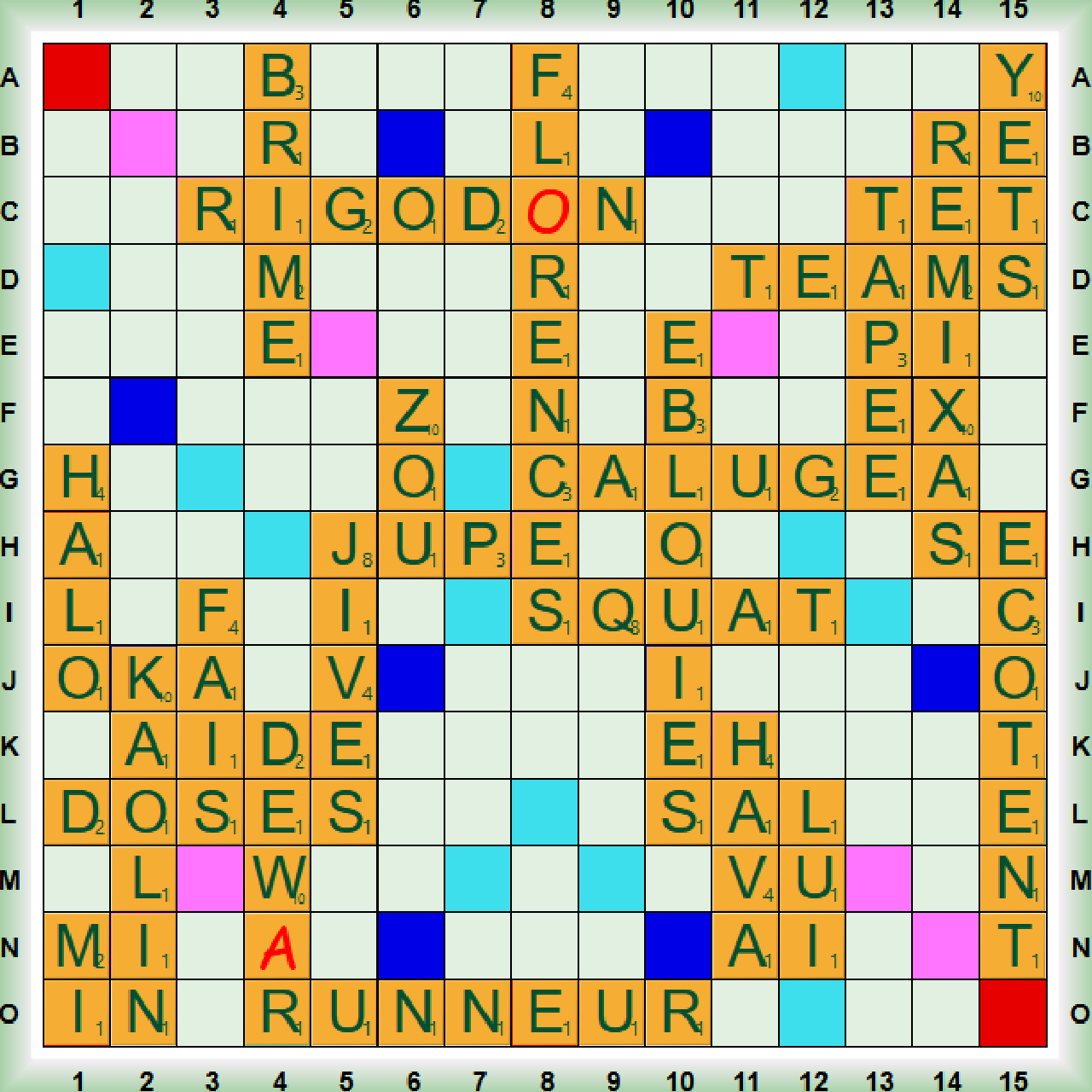La partie démarre avec JUPE, ZOU, JIVE (nm danse latine de compétition), DEW(A)R (nm phys récipient permettant de conserver le froid), Doses et le 1er scrabble CALUGEA (CALUGER ppi helv se renverser avec une luge – échouer à un examen). Après KAOLIN, nous scrabblons avec ÉBLOUIES puis nous jouons REMIXAS, YET (nm mollusque gastéropode d’Afrique occidentale) et le dernier scrabble ÉCÔTENT (ÉCÔTER vt débarrasser des feuilles de tabac de leurs côtes). Nous poursuivons avec RUNNEUR (RUNNEUR, EUSE = RUNNER), HAVA, TEAMS (TEAM nm équipe sportive), FL(O)RENCE (nf crin pour la pêche), TAPÉE, FAIS et HALO. Nous terminons avec LUI, RIGODON (=RIGAUDON nm anc danse vive et gaie), SQUAT et BRIME.