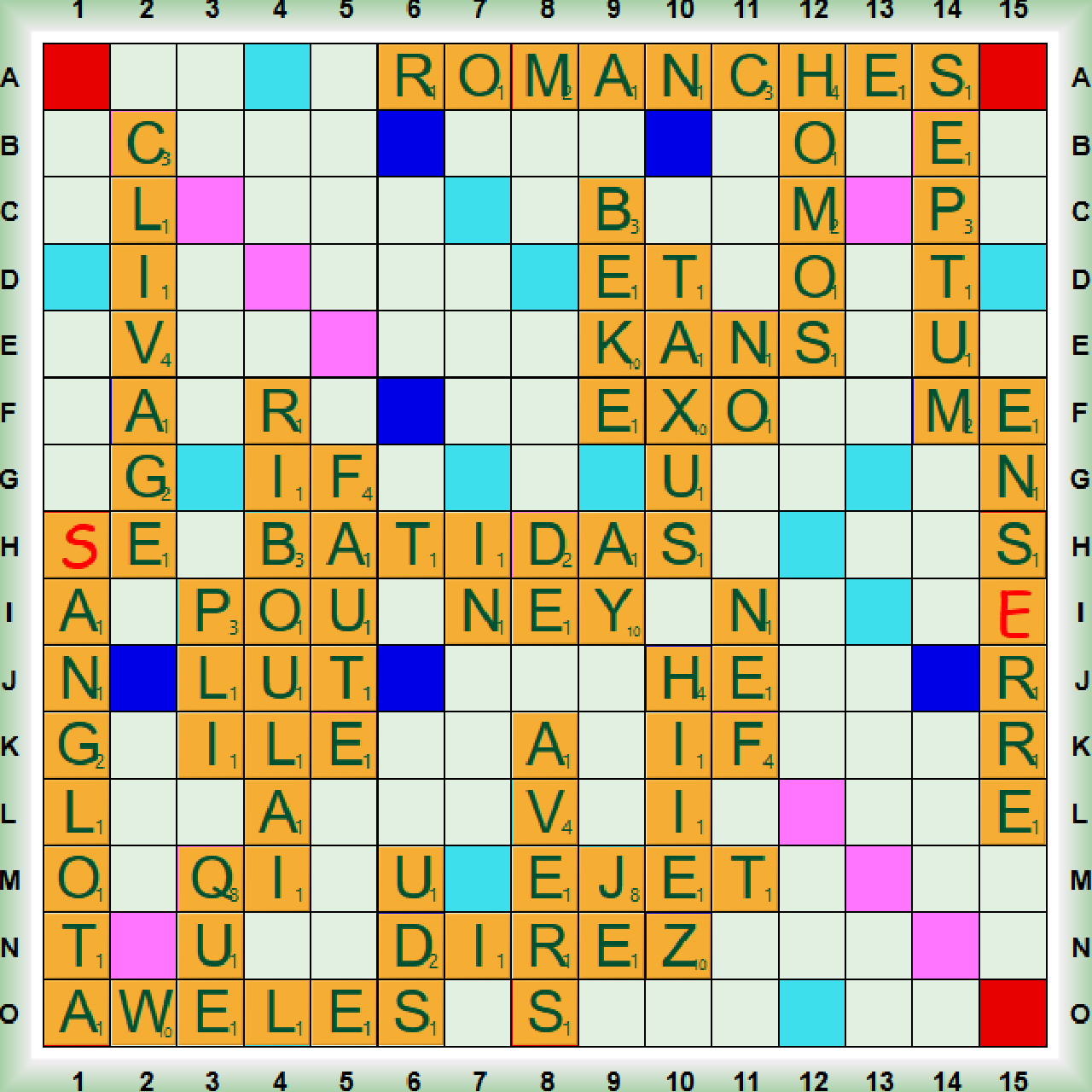 La 2ème partie qui est jouée en 2 minutes 30, démarre avec BATIDA (nf cocktail à base de noix), le 1er scrabble RIBOULAI (RIBOULER ppi fam rouler les yeux d’un air stupéfait) suivi de QUE, AWÉLÉ, UDS, TAXUS (TAXUS nm if), BÉKÉ (BÉKÉ, E n créole antillais) et NO. Nous jouons FAUTE, DIREZ, NEY, HOMOS et le 2ème scrabble ROMANCHE (nm et adj langue romane parlée en Suisse). Nous poursuivons avec AVERS (nm côté face d’une monnaie), SEPTUM (nm anat cloison séparant 2 cavités), HIIEZ, PLI et le 3ème scrabble ENS(E)RRE. Nous terminons avec ÉJET, NEF et les 2 derniers scrabbles (S)ANGLOTERA et CLIVAGE.