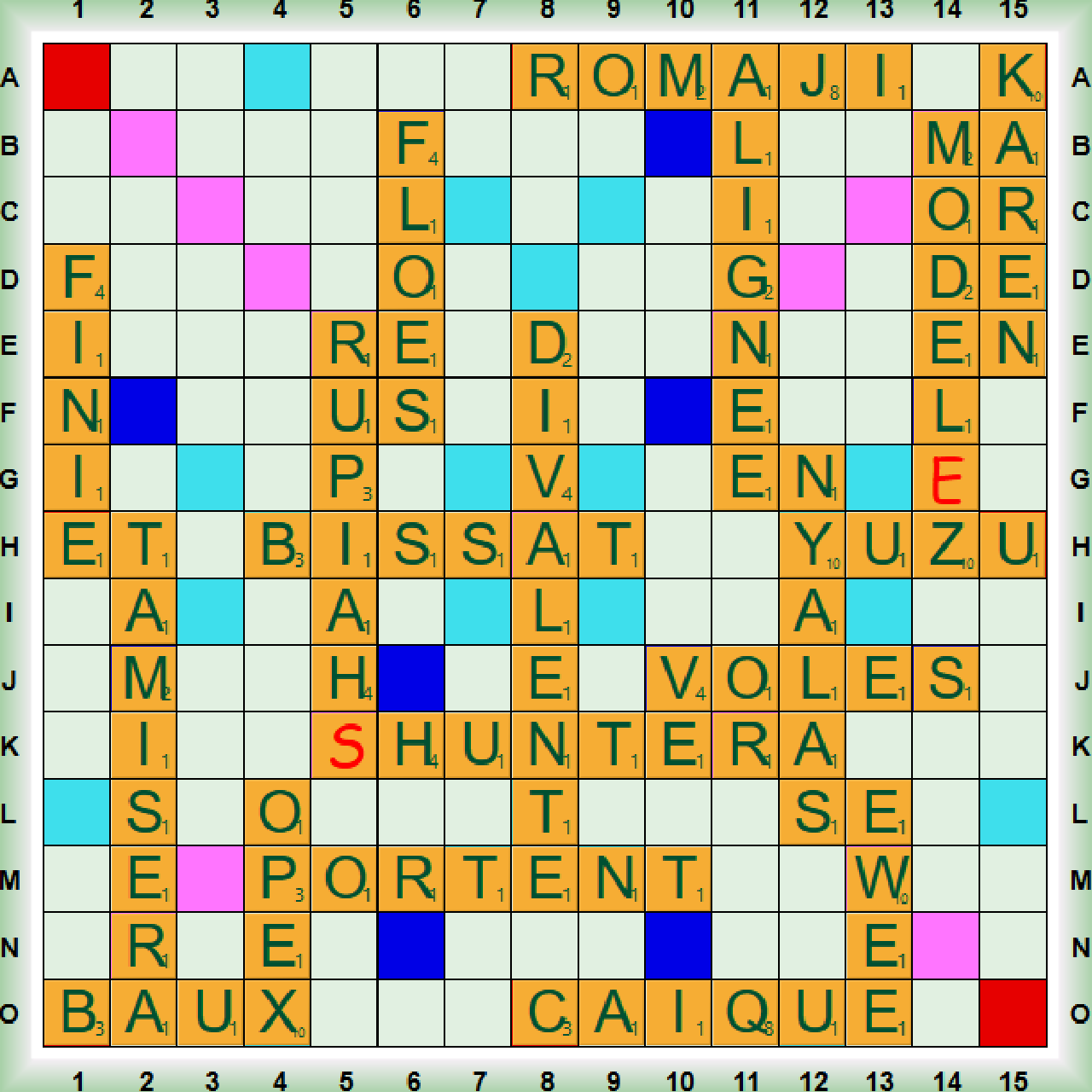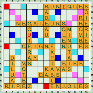 La partie démarre avec un scrabble É(C)ROUTE suivi de GYRE (nm grand tourbillon océanique) et de 2 nouveaux scrabbles BENZOLÉS (BENZOLÉ, E adj qui contient du BENZOL) et TAQUINAS. Nous jouons WESH (=WECH) suivi de 2 scrabbles CAQUERAI (CAQUER vt mettre des harengs des barriques à poissons) et TÉLÉPAYE (TÉLÉPAYER vt payer à distance) suivi de JARDINE, LUXÂT, ÉVITES et GALON qui transforme ÉVITES en LÉVITES. Nous poursuivons avec CÉDA, MOUFTE (MOUFTER = MOUFETER ppi), SHÉRIF et le dernier scrabble (U)NIOVULÉ (UNIOVULÉ, E adj bot qui n’a qu’un ovule). Nous terminons avec KIPS (KIP nm unité monétaire du Laos), MITON (nm médiév gantelet), EMBASES (EMBASE nf tech partie servant d’appui) et DU qui transforme ÉCROUTÉE en DÉCROUTÉE (débarrasser de la croute).