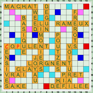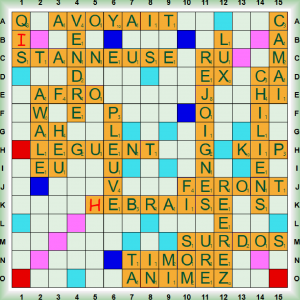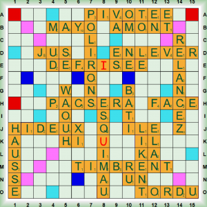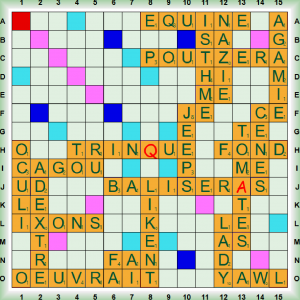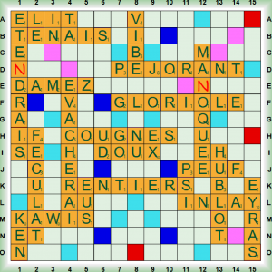 La partie démarre avec 1 scrabble COUGNES (COUGNER vt helv coincer, serrer) suivi de VACHERA (VACHER vt queb paresser – se vacher pour un ULM, se poser en pleine campagne), KAWI, KEN, FÉCULÂT et DAMEZ qui transforme VACHERAI en ÉVACHERAI (ÉVACHER (S’) vt queb fam s’affaler, s’avachir). Nous enchainons 2 scrabbles RENTIERS et TE(N)DRAIS puis nous jouons EUS, ÉLIT, TENAIS, INLAY (nm prothèse obturant la cavité dentaire), HUBLOT et EYRAS (nm chat sauvage type puma). Nous enchainons 3 scrabbles MA(N)OQUE (nf petite botte de feuille de tabac – MANOQUER vt mettre du tabac en MANOQUE), PÉJORANT (PÉJORER vt déprécier, aggraver une situation), et GLORIOLE puis nous terminons avec PEUF (nf brouillard – neige poudreuse) et VIBE (nf ambiance, ressenti).