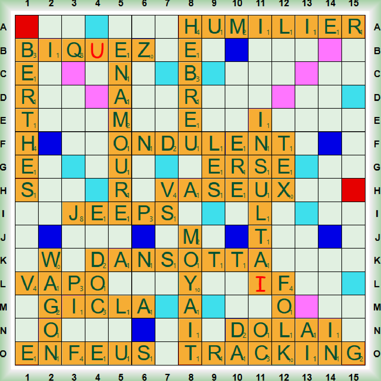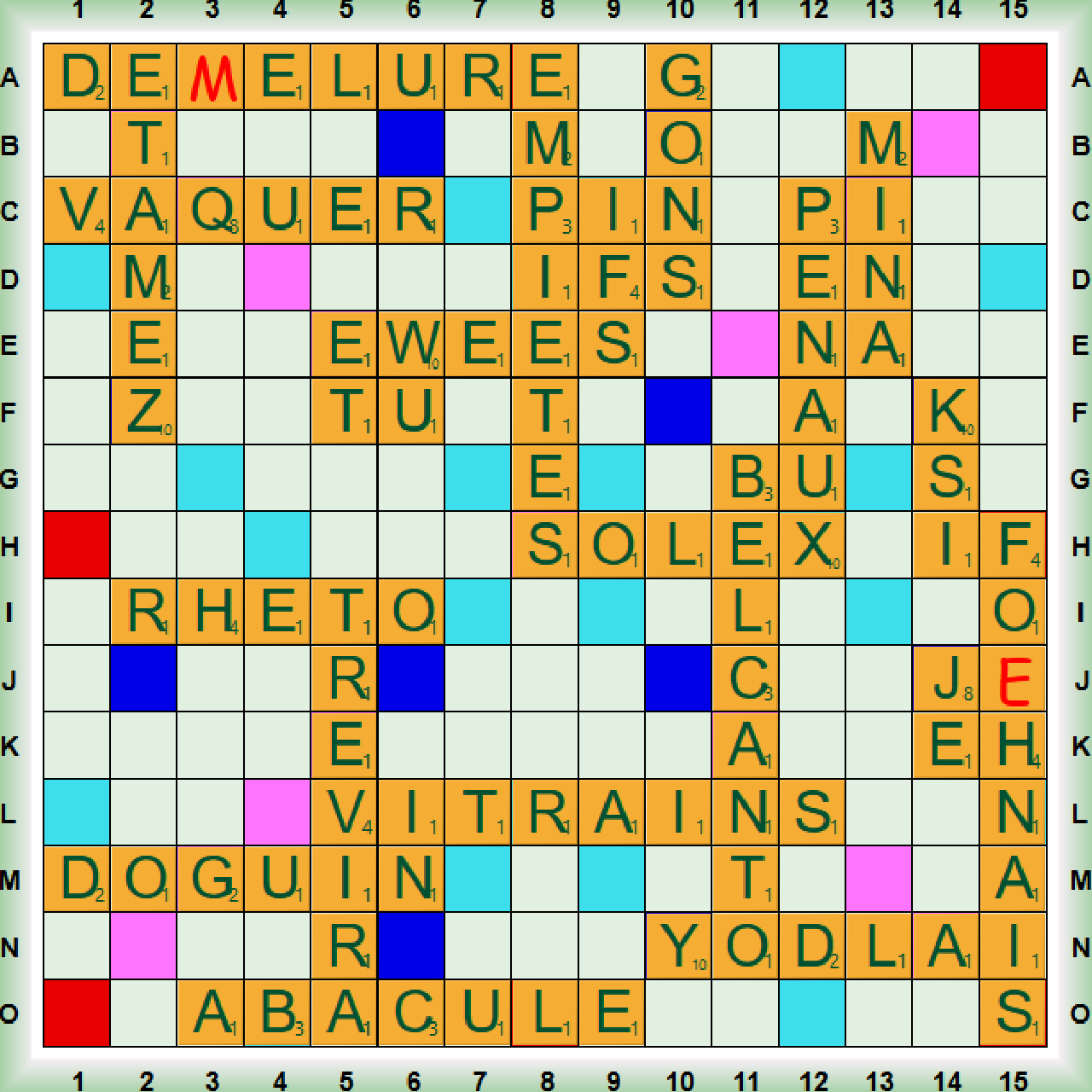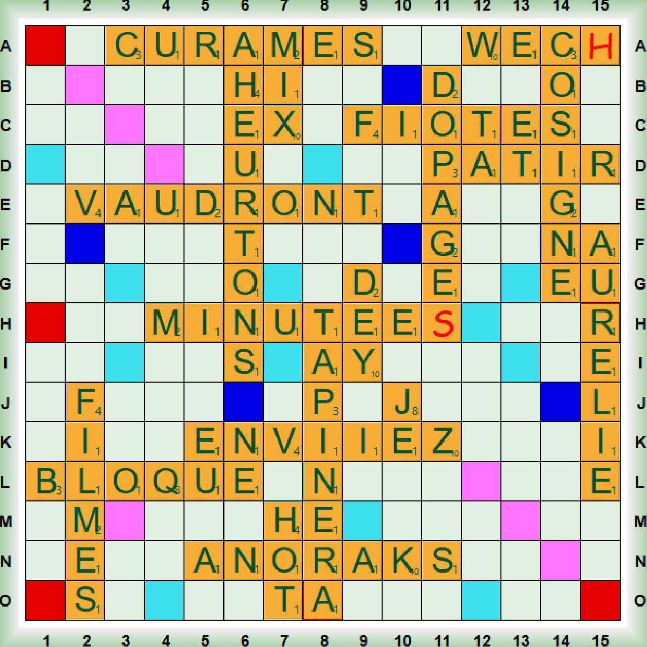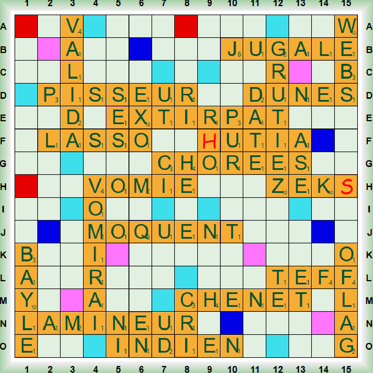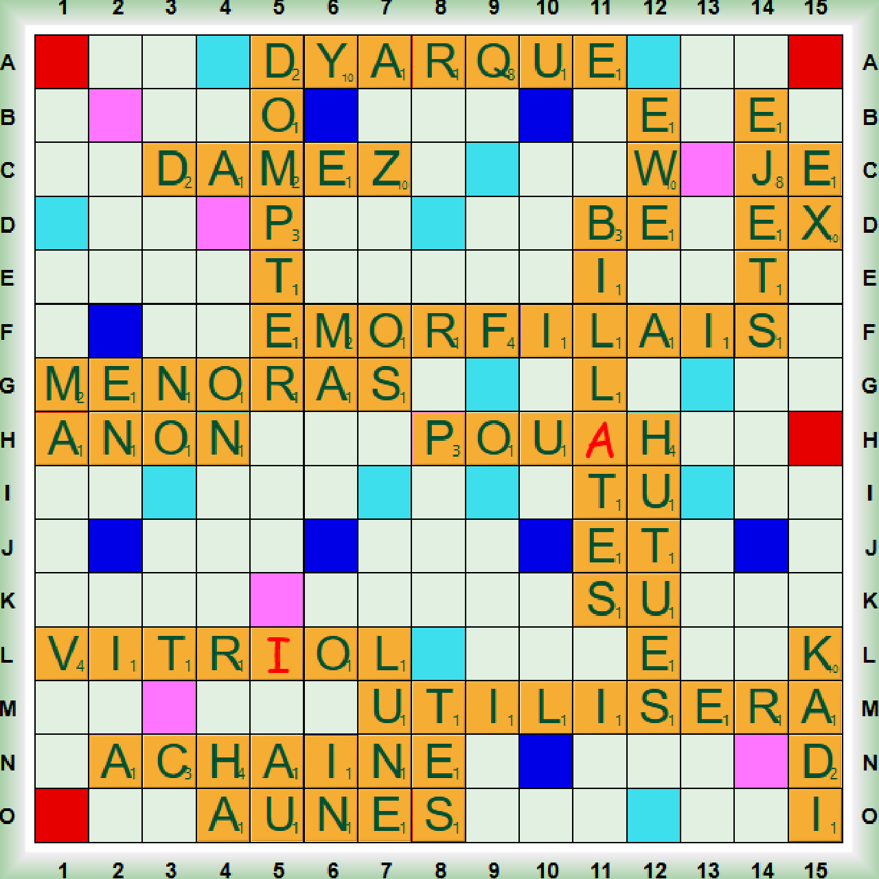 La partie, jouée en 2 min 30, débute par POU(A)H suivi de HUTUES (HUTU,E D’un peuple d’Afrique Centrale) puis deux scrabbles BILLÂTES (du verbe BILLER : Décaper par projection de billes) et UTILISER. Nous jouons ensuite ÉWÉ, un nouveau scrabble MORFILAI (du verbe MORFILER = ÉMORFILER : Débarrasser une lame de ses barbes métalliques), KADI (=CADI : nm. Juge musulman), ÉJETS (=ÉJECT : Psych. Objet de connaissance conçu comme une essence immatérielle) et DOMPTE qui forme ÉMORFILAI. Nous poursuivons avec DYARQUE (nm. Chacun des deux dirigeants d’une Dyarchie) et un nouveau scrabble ACHAINE (=ACHÈNE =AKÈNE : nm. Fruit sec à une seule graine), puis AUNES en collante intégrale et DAMEZ. Nous posons ensuite deux scrabbles : MÉNORAS (= MÉNORAH : nf. Chandelier à sept branches, du culte hébraïque) et VITR(I)OL suivi de ÂNON et SEXE en collante.